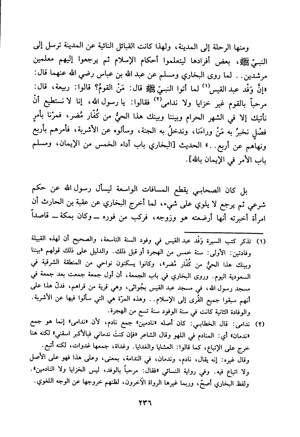 ومنها الرحلة إلى المدينة، ولهذا كانت القبائل النائية عن المدينة ترسل إلى النبي صلى الله عليه وسلم، بعض افرادها ليتعلموا أحكام الإسلام ثم يرجعوا إليهم معلمين مرشدين .. لما روى البخاري ومسلم عن عبد الله بن عباس رضي الله عنهما قال: ((إن وفد عبد القيس (1) لما أتو النبي صلى الله عليه وسلم قال: من القوم؟ قالوا: ربيعة، قال: مرحبا بالقوم غير خزايا ولا ندامى (2) فقالوا: يا رسول الله، إنا لانستطيع أن نأتيك إلا في الشهر الحرام وبيننا وبينك هذا الحي من كفار مضر، فمرنا بأمر فصل نخبر به من وراءنا، وندخل به الجنة، وسألوه عن الأشربة، فأمرهم بأربع ونهاهم عن أربع .. )) الحديث [البخاري باب أداء الخمس من الإيمان، ومسلم باب الأمر في الإيمان بالله].