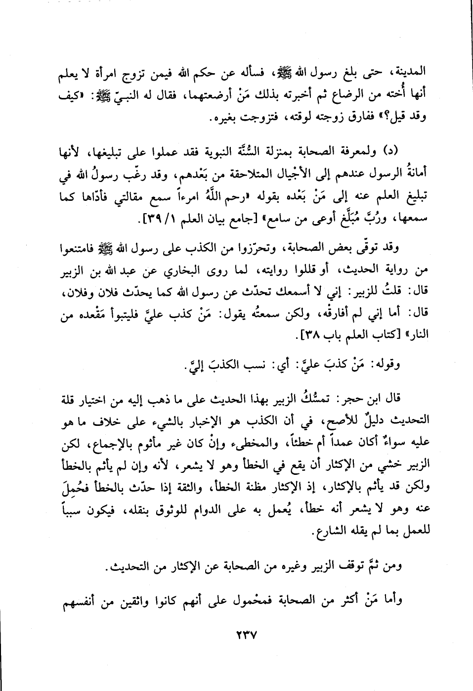قال ابن حجر: تمسك الزبير بهذا الحديث على ما ذهب إليه من اختيار قلة التحديث دليل للاصح، في أن الكذب هو الاخبار بالشيء على خلاف ما هو عليه سواء أكان عمداَ ام خطئاً، والمخطئ وان كان غير مأثوم بالاجماع، لكن الزبير خشي من الاكثار أن يقع في الخطأ وهو لا يشعر، لأنه وان لم يأثم بالخطأ ولكن قد يأثم بالأكثار، إذ الاكثار مظنة الخطأ، والثقة إذا حدث بالخطأ فحمل عنه وهو لايشعر انه خطأ، يعمل به على الدوام للوثوق بنقله، فيكون سبباً للعمل بما لم يقله الشارع.