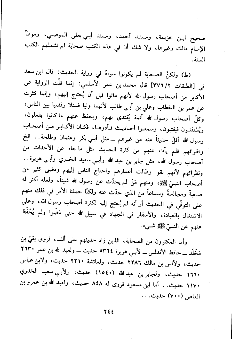 واما المكثرون من الصحابة، الذين زاد حديثهم على ألف، فروى بقي بن مخلد ـ حافظ الاندلس ـ لابي هريرة 5364 حديث ـ ولعبد الله بن عمر 2630 حديث، ولانس بن مالك 2286 حديث، ولعائشة 2210 حديث، ولابن عباس 1660 حديث، ولجابر بن عبدالله (1540) حديث، ولابي سعيد الخدري 1170 حديث .. اما ابن مسعود فروى له 848 حديث، ولعبد الله بن عمرو بن العاص (700) حديث ... …