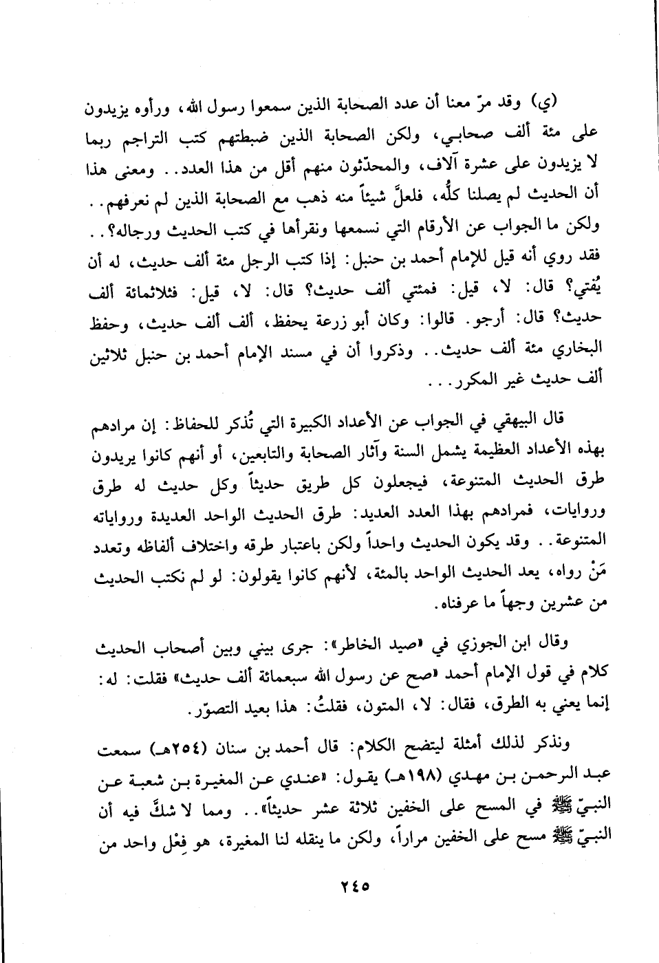 (ي) وقد مر معنا ان عدد الصحابة الذين سمعوا رسول الله، ورأوه يزيدون على مئة الف صحابي، ولكن الصحابة الذين ضبطتهم كتب التراجم ربما لايزيدون على عشرة آلاف، والمحدثون منهم اقل من هذا العدد .. ومعنى هذا ان الحديث لم يصلنا كله، فلعل شيئا منه ذهب مع الصحابة الذين لم نعرفهم .. ولكن ما الجواب عن الارقام التي نسمعها ونقرأها في كتب الحديث ورجاله؟ .. فقد روي انه قيل للإمام أحمد بن حنبل: إذا كتب الرجل مئة ألف حديث، له أن يفتي؟ قال: لا، قيل: فمئتي ألف حديث؟ قال: لا، قيل: فثلاثمائة ألف حديث؟ قال: أرجو.