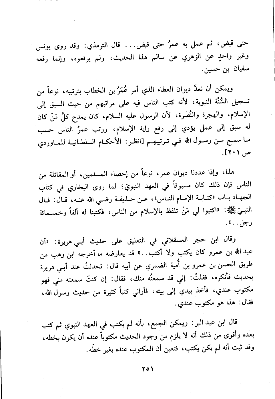 ويمكن أن نعد ديوان العطاء الذي أمر عمر بن الخطاب بترتيبه، نوعاً من تسجيل السنة النبوية، لأنه كتب الناس فيه على مراتبهم من حيث السبق الى الاسلام، والهجرة والنصرة، لأن الرسول عليه السلام، كان يمدح كل من كان له سبق الى عمل يؤدي الى رفع راية الاسلام، ورتب عمر الناس حسب ما سمع من رسول الله في ترتيبهم [انظر: الأحكام السلطانية للماوردي ص 201].