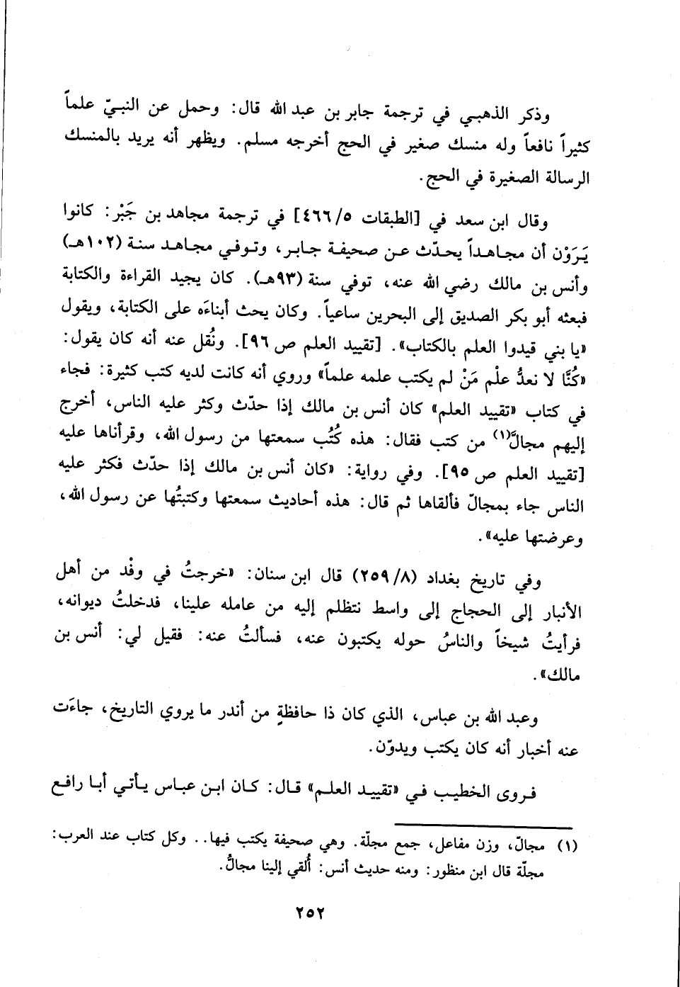 وقال ابن سعد في [الطبقات 466/ 5] في ترجمة مجاهد بن جبر: كانوا يرون أن مجاهداً يحدث عن صحيفة جابر، وتوفي مجاهد سنة (102 هـ) وأنس بن مالك رضي الله عنه، توفي سنة (93 هـ) كان يجيد القراءة والكتابة فبعثه أبو بكر الصديق الى البحرين ساعياً.
