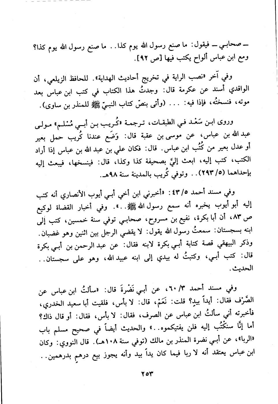 253…ـ صحابي ـ فيقول: ماصنع رسول الله يوم كذا .. ما صنع رسول الله يوم كذا؟ ومع ابن عباس ألواح يكتب فيها [ص 92].