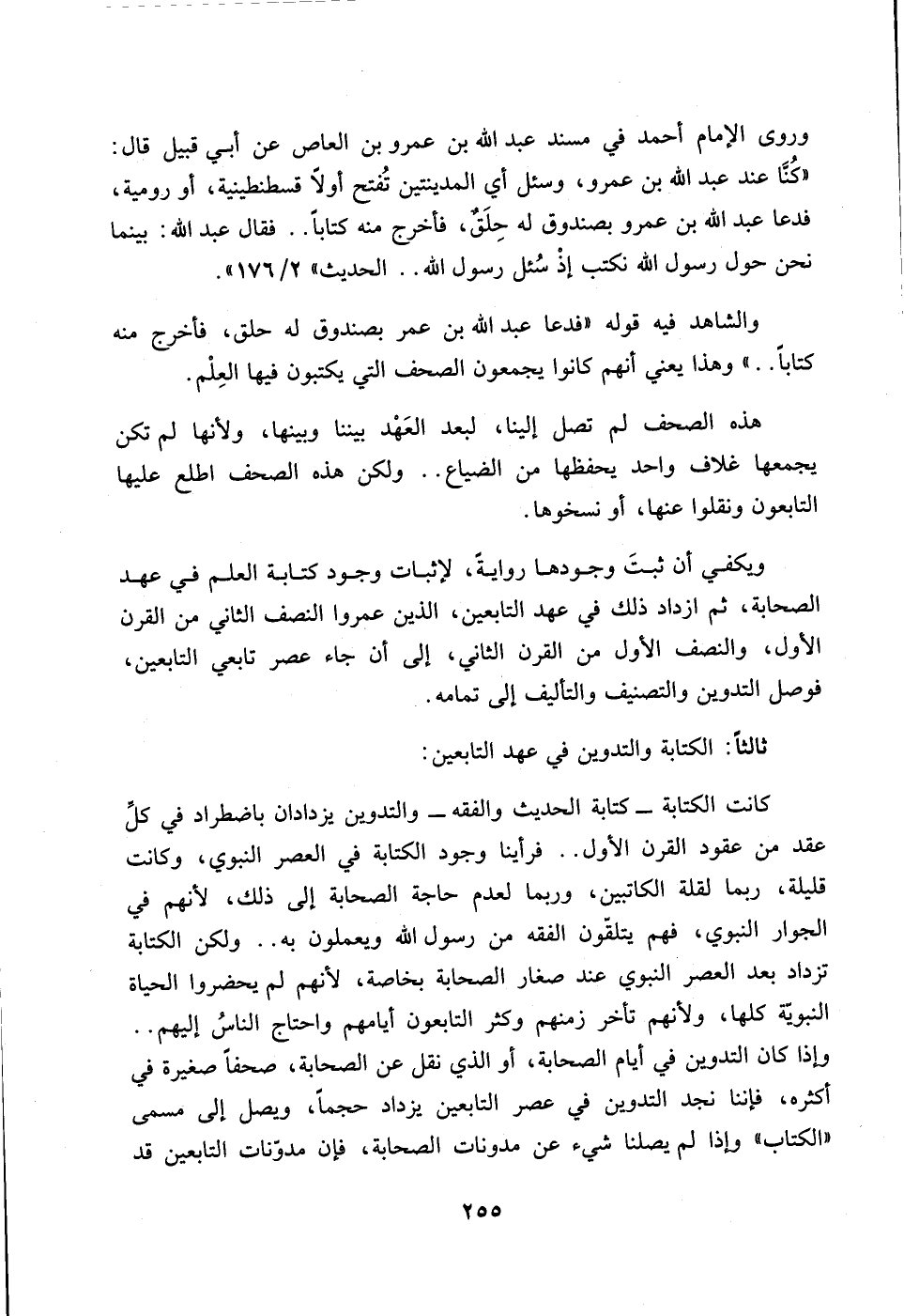 يكفي ان ثبت وجودها روايةً، لاثبات وجود كتابة العلم في عهد الصحابة ثم ازداد ذلك في عهد التابعين، الذين عمروا النصف الثاني من القرن الاول، والنصف الاول من القرن الثاني، الى ان جاء عصر تابعي التابعين، فوصل التدوين والتصنيف والتأليف الى تمامه.