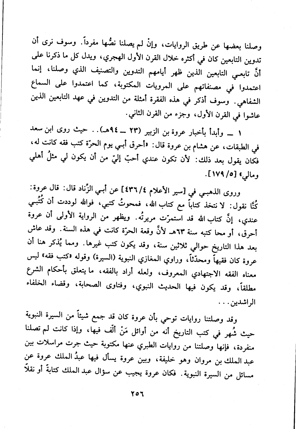 وروى الذهبي في [سير الأعلام 436/ 4] عن أبي الزناد قال: قال عروة: كنا نقول: لانتخذ كتاباً مع كتاب الله، فمحوت كتبي، فوالله لوددت أن كتبي عندي، ان كتاب الله قد استمرت مريرته.