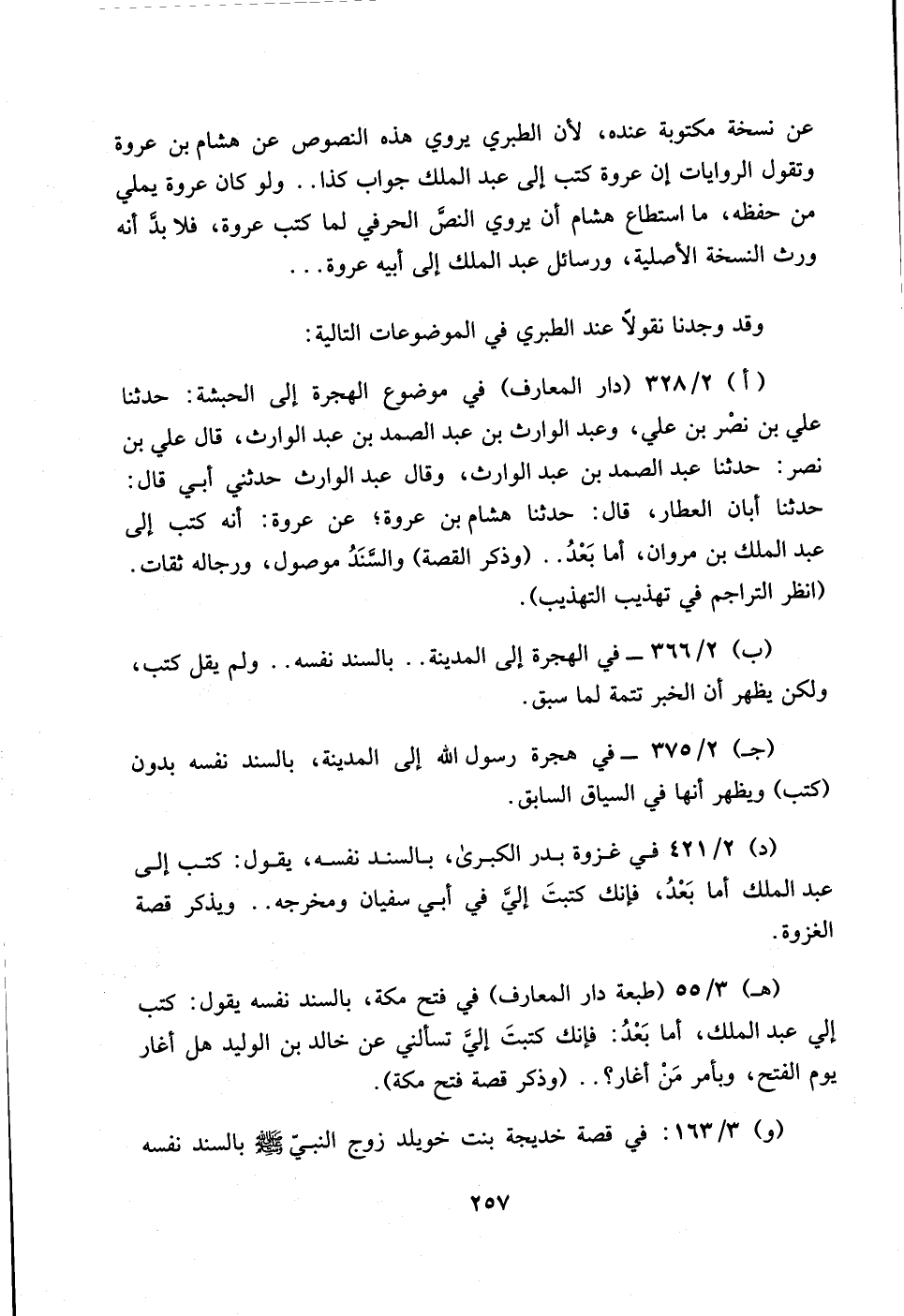 257…عن نسخة مكتوبة عنده، لأن الطبري يروي هذه النصوص عن هشام بن عروة وتقول الروايات ان عروة كتب الى عبدالملك جواب كذا .. ولو كان عروة يملي من حفظه، ما استطاع هشام أن يروي النص الحرفي لما كتب عروة، فلا بد أنه ورث النسخة الأصلية، ورسائل عبد الملك الى أبيه عروة ...