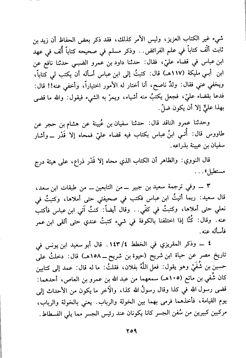 259…شيء غير الكتاب العزيز، وليس الأمر كذلك، فقد ذكر بعض الحفاظ أن زيد بن ثابت ألف كتاباً في علم الفرائض .. وذكر مسلم في صحيحه كتاباً ألف في عهد إبن عباس في قضاء علي، فقال: حدثنا داود بن عمرو الضبي حدثنا نافع عن إبن ابي مليكة (117 هـ) قال: كتبت إلى ابن عباس أسأله أن يكتب لي كتاباً، ويخفي عني فقال: ولد ناصح، أنا أختار له الأمور إختياراً، وأخفي عنه!! قال: فدعا بقضاء علي، فجعل يكتب منه أشياء، ويمر به الشيء فيقول: والله ما قضى بهذا علي إلا أن يكون ضل.