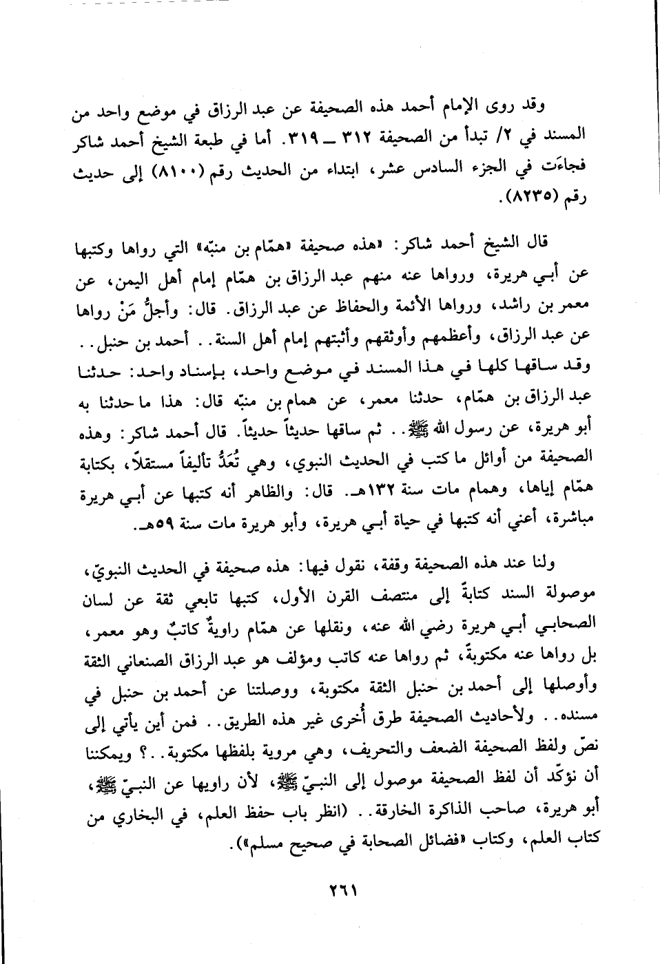 قال الشيخ أحمد شاكر: ((هذه صحيفة ((همام بن منبه)) التي رواها وكتبها عن أبي هريرة، ورواها عنه منهم عبدالرزاق بن همام امام أهل اليمن، عن معمر بن راشد، ورواها الائمة والحفاظ عن عبدالرزاق.