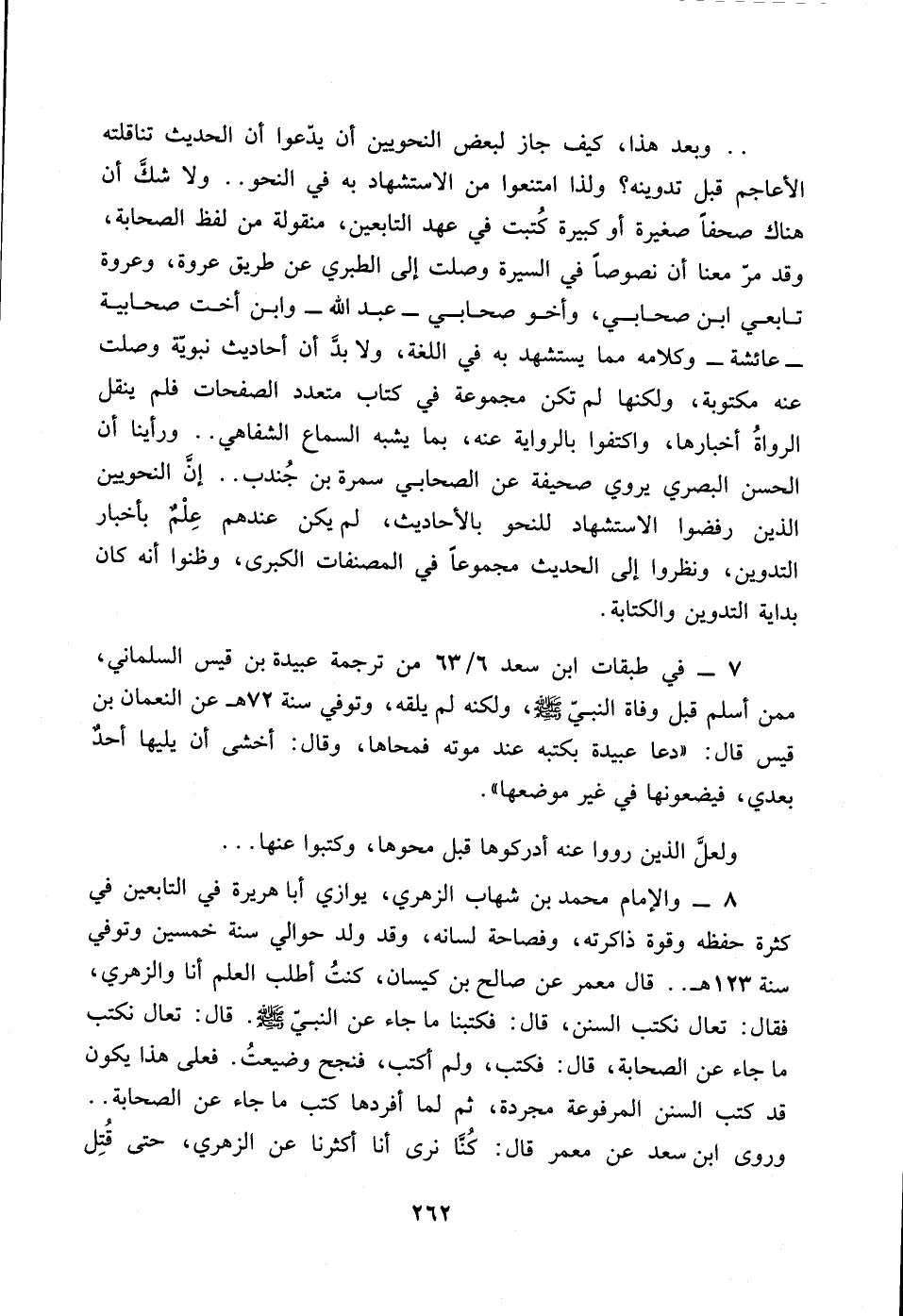262… .. وبعد هذا، كيف جاز لبعض النحويين أن يدعوا ان الحديث تناقلته الأعاجم قبل تدوينه؟ ولذا امتنعوا من الاستشهاد به في النحو .. ولا شك أن هناك صحفاً صغيرة أو كبيرة كتبت في عهد التابعين، منقولة من لفظ الصحابة، وقد مر معنا أن نصوصاً في السيرة وصلت الى الطبري عن طريق عروة، وعروة تابعي أبن صحابي، وأخو صحابي ـ عبدالله ـ وابن أخت صحابية ـ عائشة ـ وكلامه مما يستشهد به في اللغة، ولا بد أن احاديث نبوية وصلت عنه مكتوبة، ولكنها لم تكن مجموعة في كتاب متعدد الصفحات فلم ينقل الرواة أخبارها، واكتفوا بالرواية عنه، بما يشبه السماع الشفاهي .. وراينا أن الحسن البصري يروي صحيفة عن الصحابي سمرة بن جندب .. ان النحويين الذين رفضوا الاستشهاد للنحو بالأحاديث، لم يكن عندهم علم بأخبار التدوين، ونظروا الى الحديث مجموعاً في المصنفات الكبرى، وظنوا انه كان بداية التدوين والكتابة.