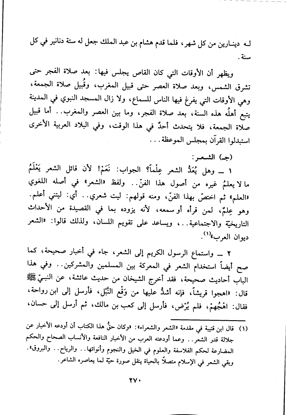 (1) قال ابن قتيبة في مقدمة ((الشعر والشعراء)): ((وكان حق هذا الكتاب أن أودعه الأخبار عن جلالة قدر الشعر .. وعما أودعته العرب من الأخبار النافعة والأنساب الصحاح والحكم المضارعة لحكم الفلاسفة والعلوم في الخيل والنجوم وأنوائها .. والرياح .. والبروق)).