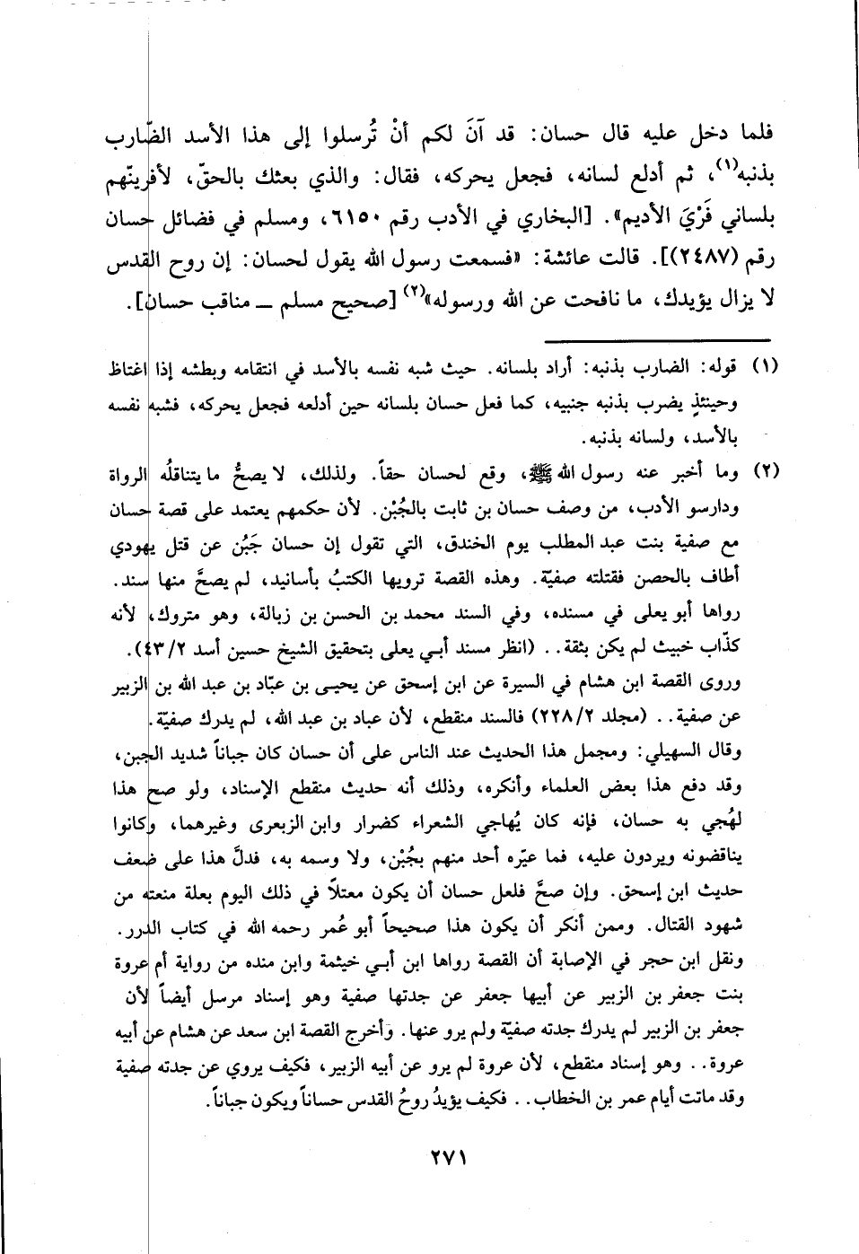 (2) وما أخبر عنه رسول الله صلى الله عيله وسلم، وقع لحسان حقاً. ولذلك، لايصح مايتناقله الرواة ودارسوا الأدب، من وصف حسان بن ثابت بالجبن. لأن حكمهم يعتمد على قصة حسان مع صفية بنت عبدالمطلب يوم الخندق، التي تقول ان حسان جبن عن قتل يهودي أطاف بالحصن فقتلته صفية، وهذه القصة ترويها الكتب بأسانيد، لم يصح منها سند. رواها أبو يعلى في مسنده، وفي السند محمد بن الحسن بن زبالة، وهو متروك، لأنه كذاب خبيث لم يكن بثقة .. (انظر مسند أبي يعلى بتحقيق الشيخ حسين أسد 43/ 2). وروى القصة ابن هشام في السيرة عن ابن اسحق عن يحيى بن عباد بن عبدالله بن الزبير عن صفية .. (مجلد 228/ 2) فالسند منقطع، لأن عباد بن عبدالله، لم يدرك صفية. وقال السهيلي: ومجمل هذا الحديث عند الناس على أن حسان كان جباناً شديد الجبن، وقد دفع هذا بعض العلماء وأنكره، وذلك أنه حديث منقطع الاسناد، ولو صح هذا لهجي به حسان، فانه كان يهاجي الشعراء كضرار وابن الزبعرى وغيرهما، وكانوا يناقضونه ويردون عليه، فما عيره أحد منهم بجبن، ولا وسمه به، فدل هذا على ضعف حديث ابن اسحق. وان صح فلعل حسان أن يكون معتلاً في ذلك اليوم بعلة منعته من شهود القتال. وممن أنكر أن يكون هذا صحيحاً أبو عمر رحمه الله في كتاب الدرر. ونقل ابن حجر في الإصابة أن القصة رواها ابن أبي خيثمة وابن منده من رواية أم عروة بنت جعفر بن الزبير عن أبيها جعفر عن جدتها صفية وهو إسناد مرسل ايضاً لأن جعفر بن الزبير لم يدرك جدته صفية ولم يرو عنها. وأخرج القصة ابن سعد عن هشام عن أبيه عروة .. وهو اسناد منقطع، لأن عروة لم يرو عن أبيه الزبير، فكيف يروي عن جدته صفية وقد ماتت أيام عمر بن الخطاب .. فكيف يؤيد روح القدس حساناً ويكون جباناً.