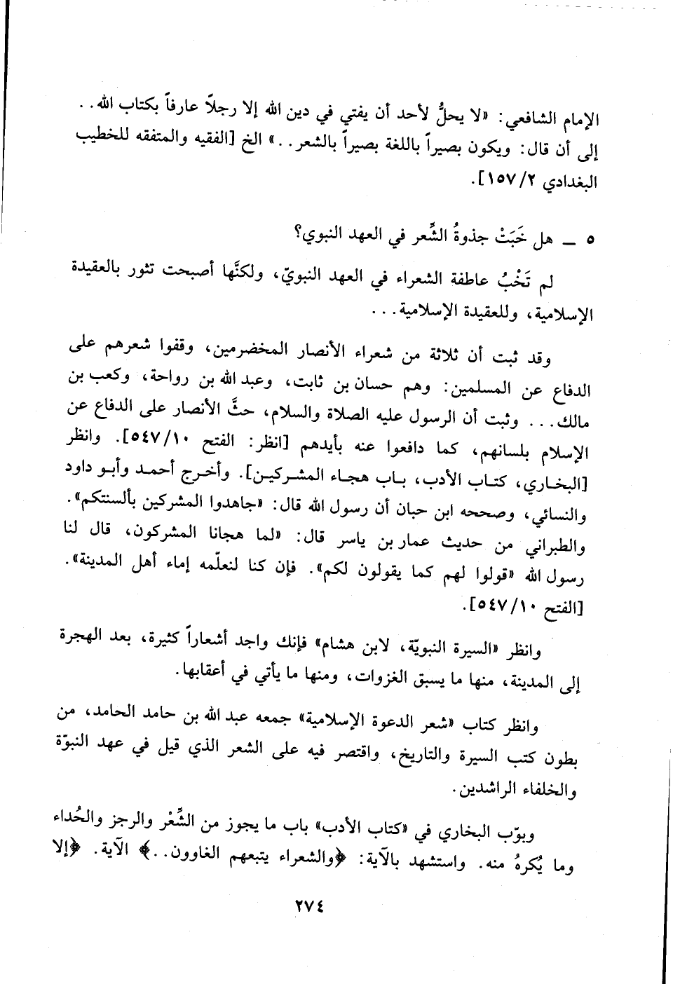 274…الامام الشافعي: ((لا يحل لاحد ان يفتي في دين الله إلا رجلاً عارفاً بكتاب الله .. إلى ان قال: ويكون بصيراً باللغة بصيراً بالشعر .. )) الخ [الفقيه والمتفقه للخطيب البغدادي 2/ 157].