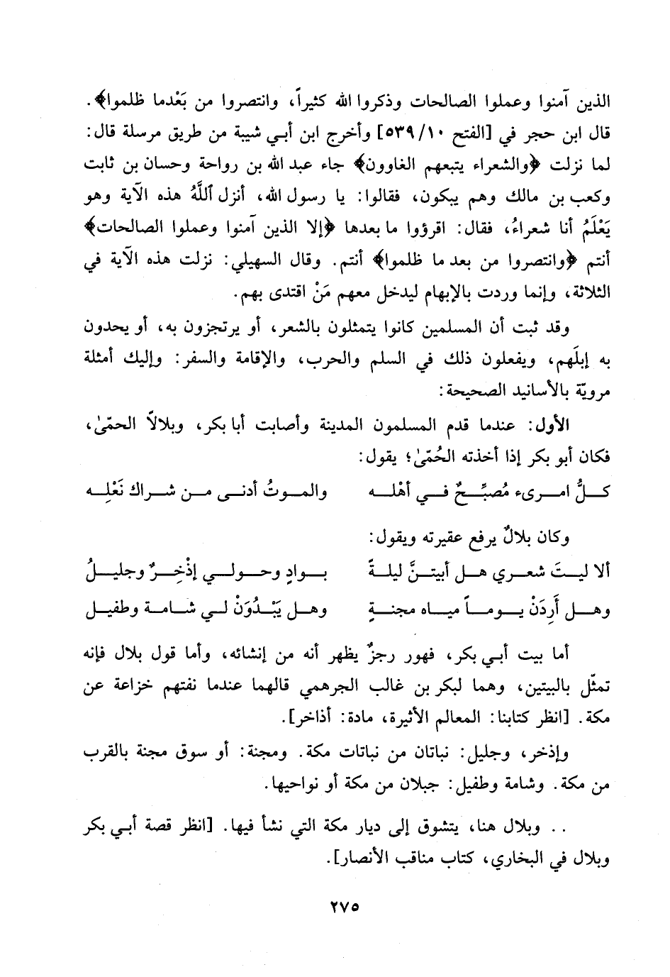 أما بيت ابي بكر، فهور رجز يظهر أنه من انشائه، واما قول بلال فانه تمثل بالبيتين، وهما لبكر بن غالب الجرهمي قالهما عندما نفتهم خزاعة عن مكة. [انظر كتابنا: المعالم الاثيرة، مادة: اذاخر].