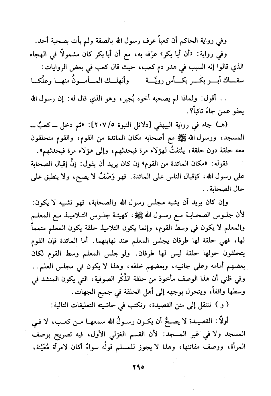 (هـ) جاء في رواية البيهقي [دلائل النبوة 5/ 207]: ((ثم دخل ـ كعب ـ المسجد، ورسول الله صلى الله عليه وسلم مع اصحابه مكان المائدة من القوم، والقوم متحلقون معه حلقة دون حلقة، يلتفت لهؤلاء مرة فيحدثهم، والى هؤلاء مرة فيحدثهم)).
