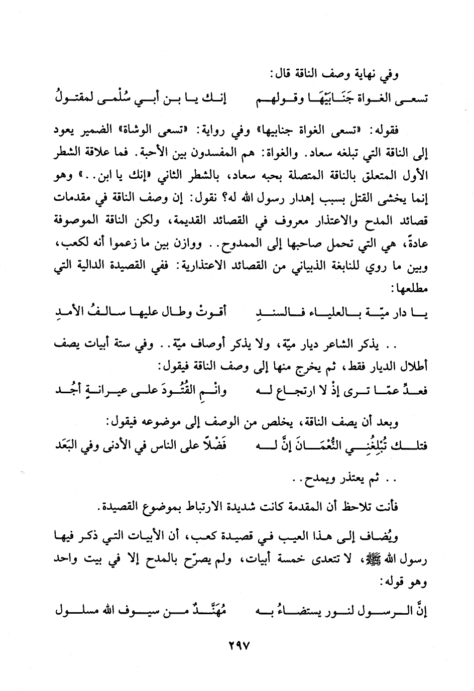 فما علاقة الشطر الاول المتعلق بالناقة المتصلة بحبه بسعاد، بالشطر الثاني ((انك يا ابن .. )) وهو انما يخشى الغدر بسبب اهدار رسول الله له؟ نقول: ان وصف الناقة في مقدمات قصائد المدح والاعتذار معروف في القصائد القديمة، ولكن الناقة الموصوفة عادةً، هي التي تحمل صاحبها الى الممدوح .. ووازن بين ما زعموا انه لكعب، وبين ما روي للنابغة الذبياني من القصائد الاعتذارية: ففي القصيدة الدالية التي مطلعها: