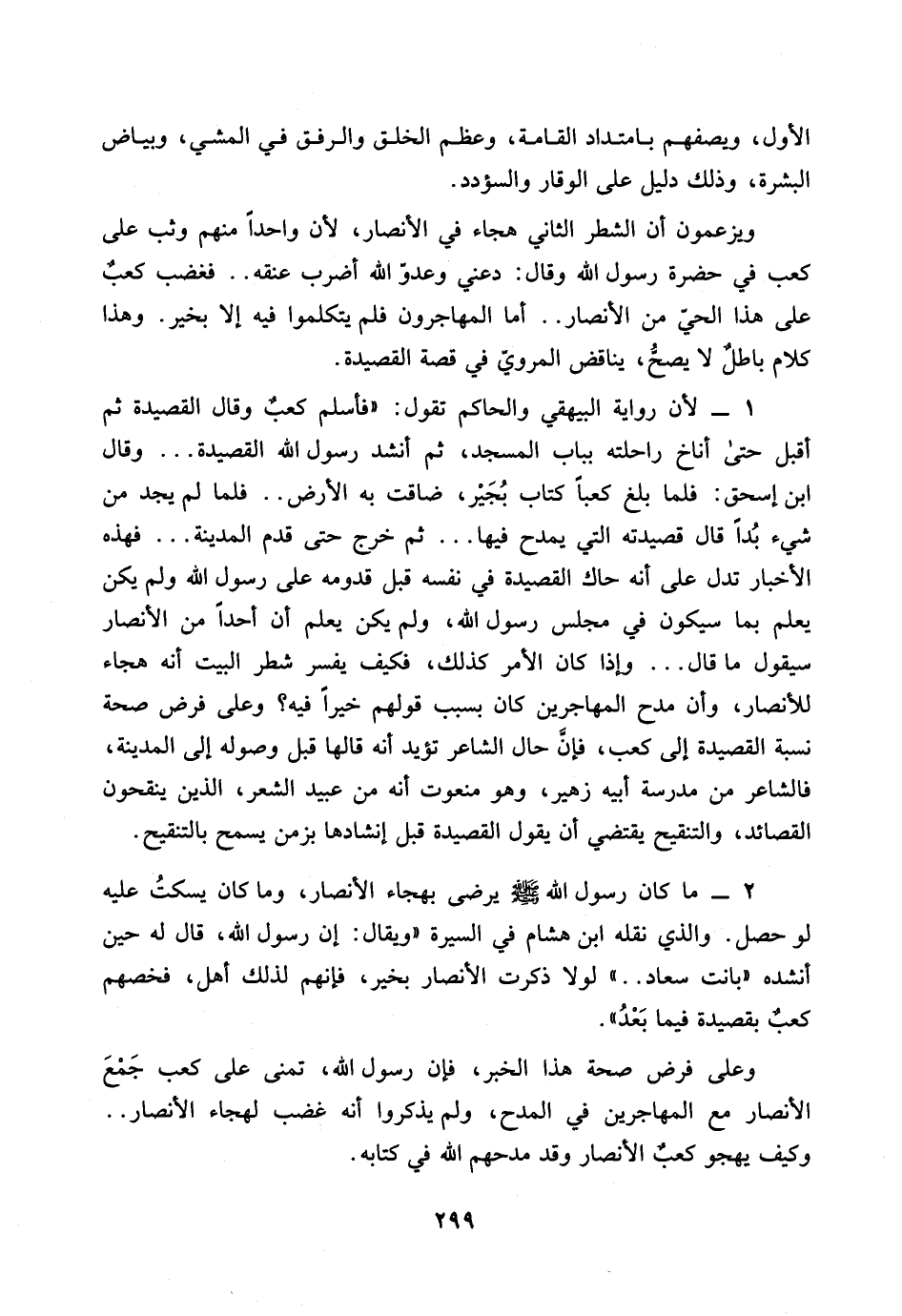 1 ـ لأن رواية البيهقي والحاكم تقول: ((فأسلم كعب وقال القصيدة ثم أقبل حتى أناخ راحلته بباب المسجد، ثم أنشد رسول الله القصيدة ... وقال ابن اسحق: فلما بلغ كعباً كتاب بجير، ضاقت به الارض .. فلما لم يجد من شيء بداً قال قصيدته التي يمدح فيها ... ثم خرج حتى قدم المدينة ... فهذه الأخبار تدل على أنه حاك القصيدة في نفسه قبل قدومه على رسول الله ولم يكن يعلم بما سيكون في مجلس رسول الله، ولم يكن يعلم ان احداً من الأنصار سيقول ما قال ... واذا كان الأمر كذلك، فكيف يفسر شطر البيت أنه هجاء للانصار، وان مدح المهاجرين كان بسبب قولهم خيراً فيه؟ وعلى فرض صحة نسبة القصيدة الى كعب، فان حال الشاعر تؤيد انه قالها قبل وصوله الى المدينة، فالشاعر من مدرسة أبيه زهير، وهو منعوت أنه من عبيد الشعر، الذين ينقحون القصائد، والتنقيح يقتضي ان يقول قبل انشادها بزمن يسمح بالتنقيح.