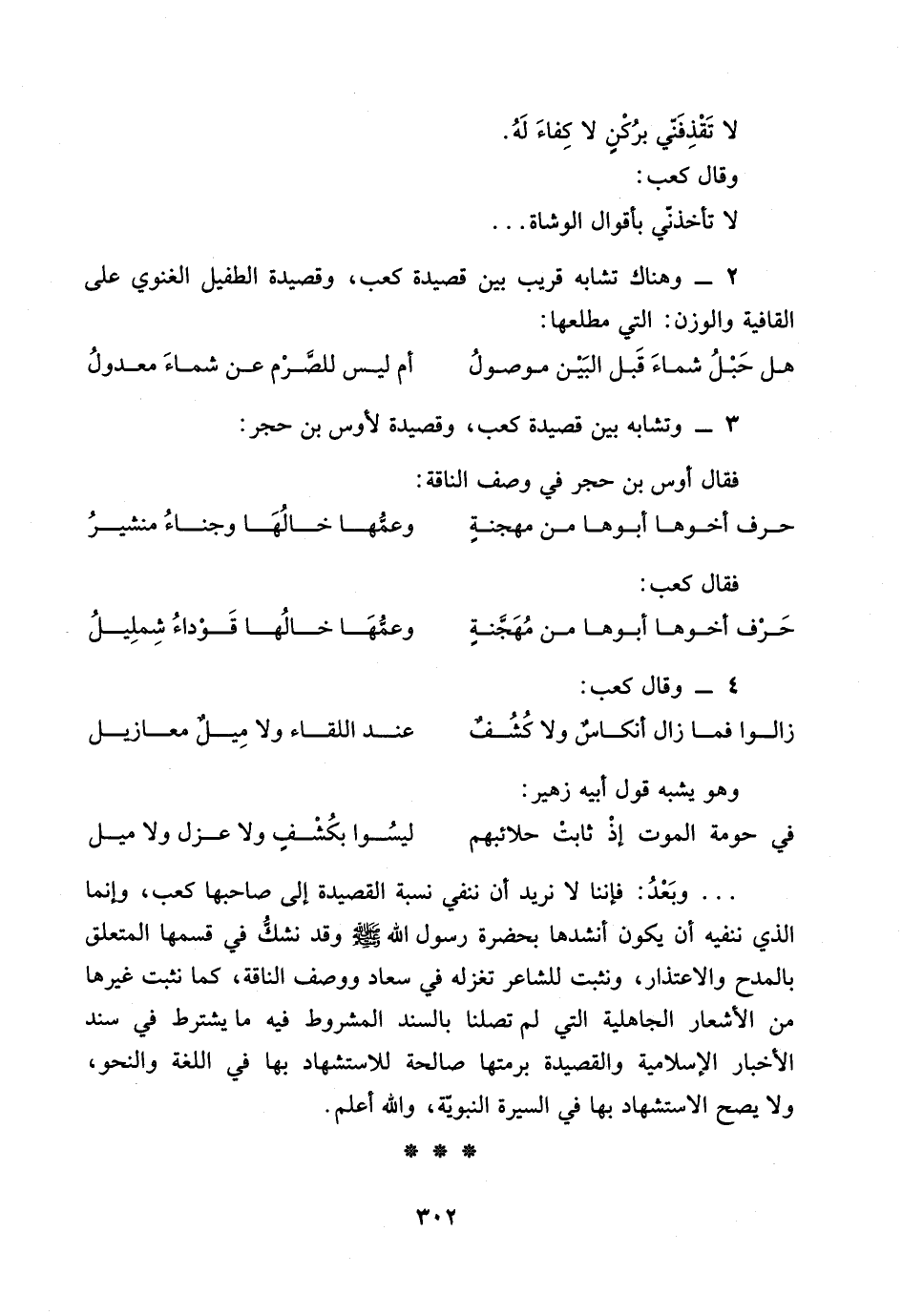 ... وبعد: فاننا لانريد ان ننفي نسبة القصيدة إلى صاحبها كعب , وإنما الذي ننفيه ان يكون انشدها بحضرة رسول الله صلى الله عليه وسلم وقد نشك في قسمها المتعلق بالمدح والاعتذار , ونثبت للشاعر تغزله في سعاد ووصف الناقة , كما نثبت غيرها من الاشعار الجاهلية التي لم تصلنا بالسند المشروط فيه ما يشترط في سند الاخبار الاسلامية والقصيدة برمتها صالحة للاستشهاد بها في اللغة والنحو , ولا يصح الاستشهاد بها في السيرة النبوية , والله أعلم.
