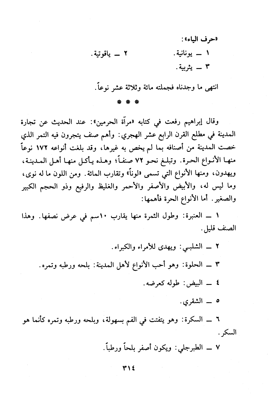 * * * وقال ابراهيم رفعت في كتابه ((مرآة الحرمين)): عند الحديث عن تجارة المدينة في مطلع القرن الرابع عشر الهجري: وأهم صنف يتجرون فيه التمر الذي خصت المدينة من اصنافه بما لم يخص به غيرها، وقد بلغت انواعه 172 نوعاً منها الأنواع الحرة.