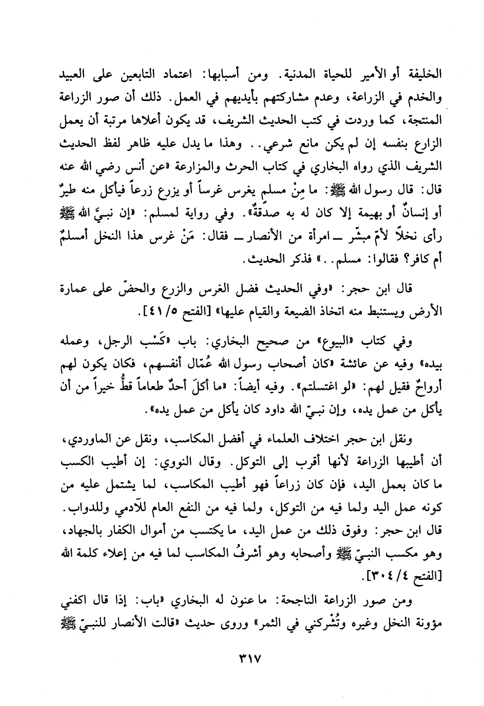 ذلك أن صور الزراعة المنتجة، كما وردت في كتب الحديث الشريف، قد يكون أعلاها مرتبة أن يعمل الزارع بنفسه إن لم يكن مانع شرعي .. وهذا ما يدل عليه ظاهر لفظ الحديث الشريف الذي رواه البخاري في كتاب الحرث و المزارعة ((عن انس رضي الله عنه قال: قال رسول الله صلى الله عليه وسلم: ما من مسلم يغرس غرساً او يزرع زرعاً فيأكل منه طير أو انسان او بهيمة إلا كان له به صدقة)).