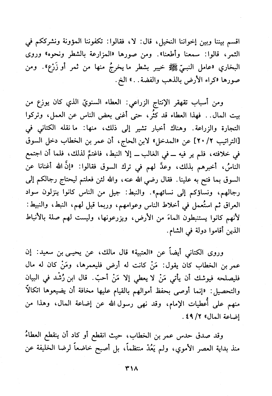 وروى الكتاني ايضاً عن ((العتبية)) قال مالك، عن يحيى بن سعيد: ان عمر بن الخطاب كان يقول: من كانت له ارض فليعمرها، ومن كان له مال فليصلح فيوشك ان يأتي من لا يعطي إلا من أحب.