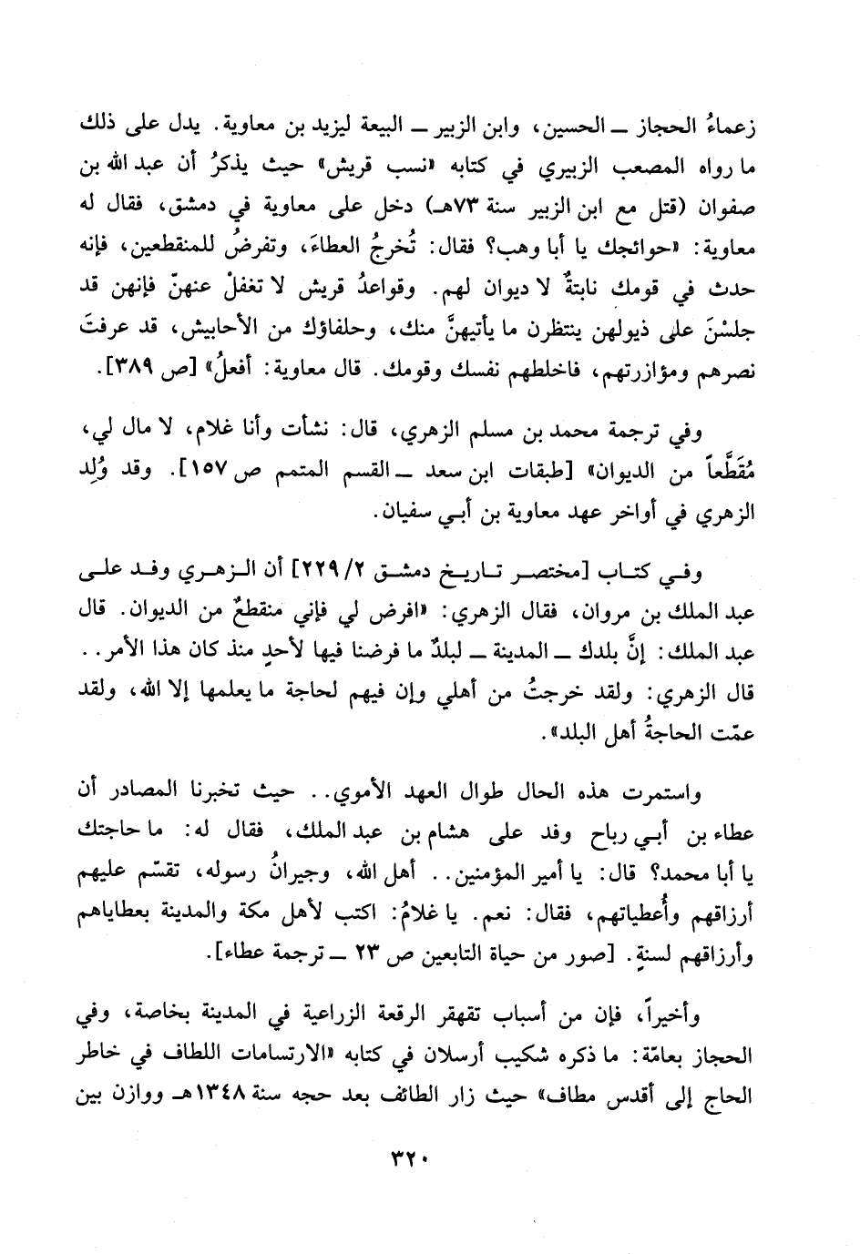 320…زعماء الحجاز ـ الحسين، وابن الزبير ـ البيعة ليزيد بن معاوية. يدل على ذلك ما رواه المصعب الزبيري في كتابه ((نسب قريش)) حيث يذكر ان عبد الله بن صفوان (قتل مع ابن الزبير سنة 73 هـ) دخل على معاوية في دمشق، فقال له معاوية: ((حوائجك ياأبا وهب؟ فقال: تخرج العطاء، وتفرض للمنقطعين، فإنه حدث في قومك نابتة لا ديوان لهم.