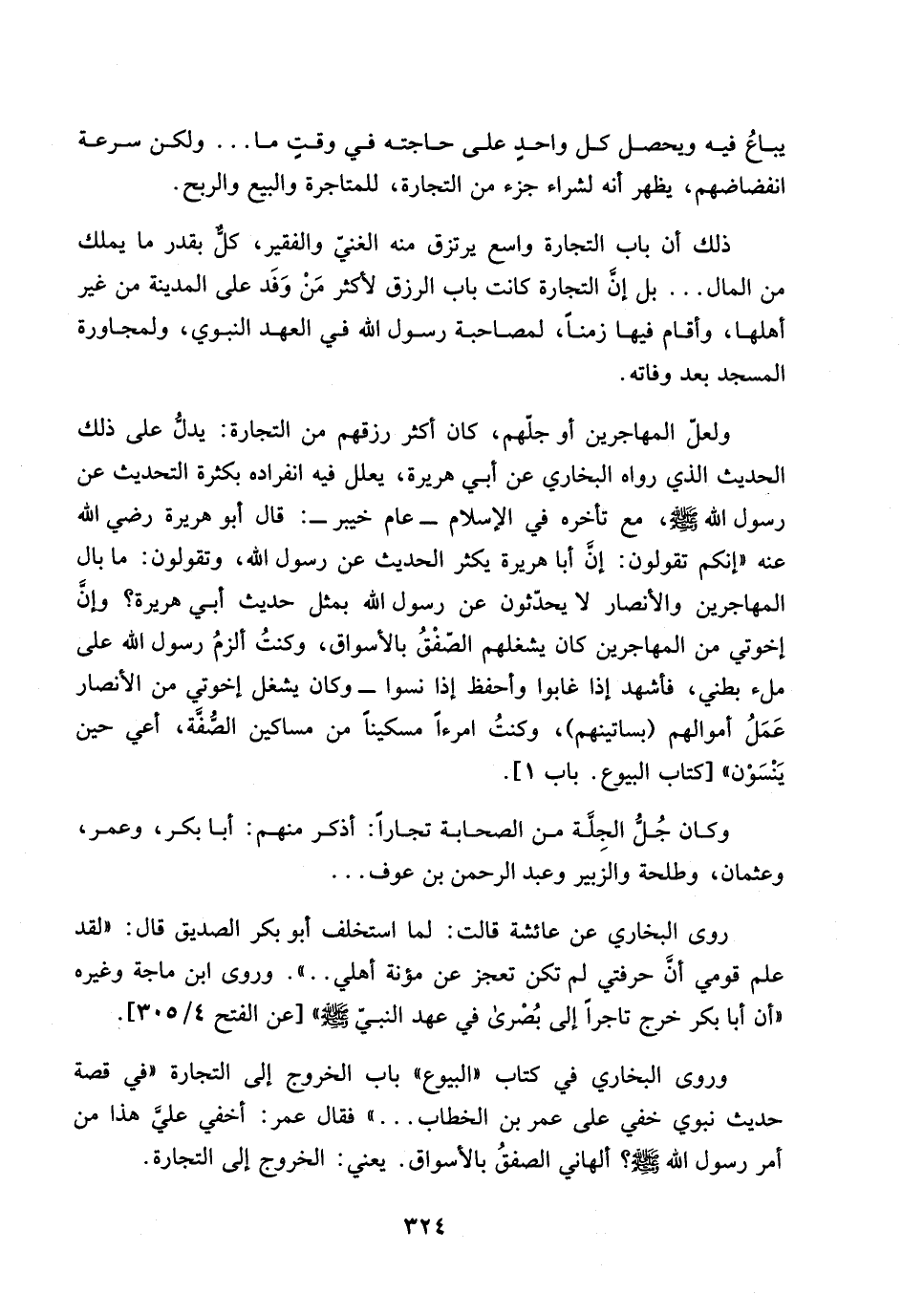 ولعل المهاجرين أو جلهم، كان اكثر رزقهم من التجارة: يدل على ذلك الحديث الذي رواه البخاري عن ابي هريرة، يعلل فيه انفراده بكثرة التحديث عن رسول الله صلى الله عليه وسلم، مع تأخيره في الإسلام ـ عام خيبر ـ: قال ابو هريرة رضي الله عنه ((انكم تقولون: إن ابا هريرة يكثر الحديث عن رسول الله، وتقولون: ما بال المهاجرين والأنصار لا يحدثون عن رسول الله يمثل حديث ابي هريرة؟ وان اخوتي من المهاجرين كان يشغلهم الصفق بالأسواق، وكنت الزم رسول الله على ملء بطني، فأشهد إذا غابوا وأحفظ اذا نسوا ـ وكان يشغل اخوتي من الأنصار عمل اموالهم (بساتينهم)، وكنت امرءاً مسكيناً من مساكين الصفة، اعي حين ينسون)) [كتاب البيوع. باب 1].