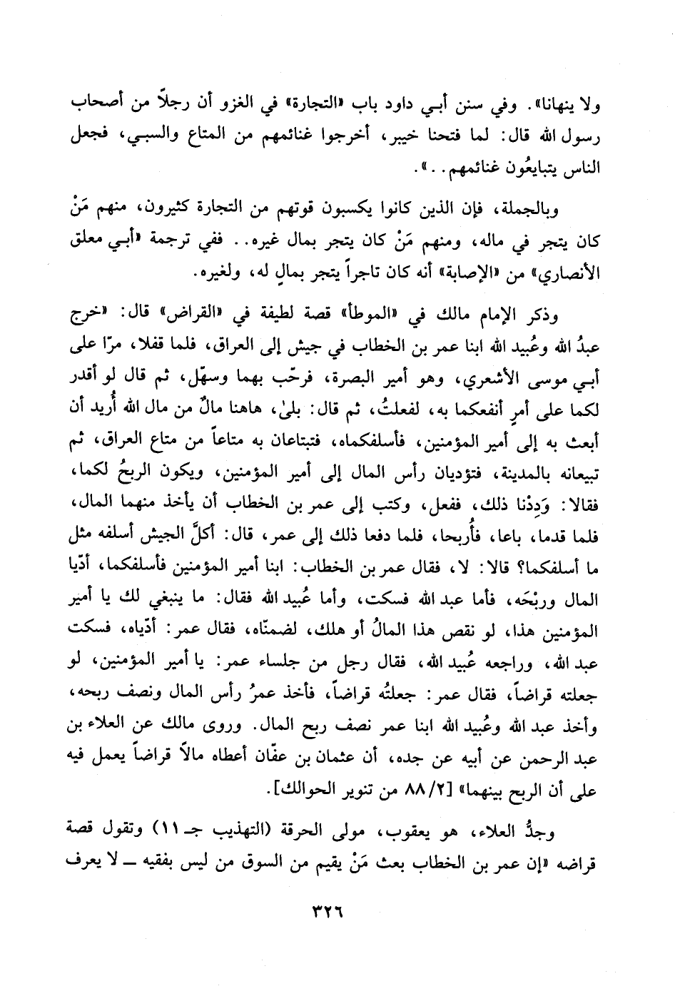 وذكر الامام مالك في ((الموطأ)) قصة لطيفة في ((القراض)) قال: ((خرج عبد الله وعبيد الله ابنا عمر بن الخطاب في جيش الى العراق، فلما قفلا، مرا على ابي موسى الاشعري، وهو امير البصرة، فرحب بهما وسهل، ثم قال لو اقدر لكما على امر انفعكما به، لفعلت، ثم قال: بلى، هاهنا مال من مال الله اريد ان ابعث به الى امير المؤمنين، فأسلفكماه، فتبتاعان به متاعاً من متاع العراق، ثم تبيعانه بالمدينة، فتؤديان رأس المال الى امير المؤمنين، ويكون الربح لكما، فقالا: وددنا ذلك، ففعل، وكتب الى عمر بن الخطاب ان يأخذ منهما المال، فلما قدما، باعا، فاربحا، فلما دفعا ذلك الى عمر، قال: اكل الجيش اسلفه مثل ما أسلفكما؟ قالا: لا، فقال عمر بن الخطاب: ابنا امير المؤمنين فأسلفكما، أديا المال وربحه، فأما عبد الله فسكت، واما عبيد الله فقال: ما ينبغي لك يا امير المؤمنين هذا، لو نقص هذا المال او هلك، لضمناه، فقال عمر: أدياه، فسكت عبد الله، وراجعه عبيد الله، فقال رجل من جلساء عمر: ياأمير المؤمنين، لو جعلته قراضاً، فقال عمر: جعلته قراضاً فأخذ عمر رأس المال ونصف ربحه، وأخذ عبد الله وعبيد الله ابنا عمر نصف ربح المال.