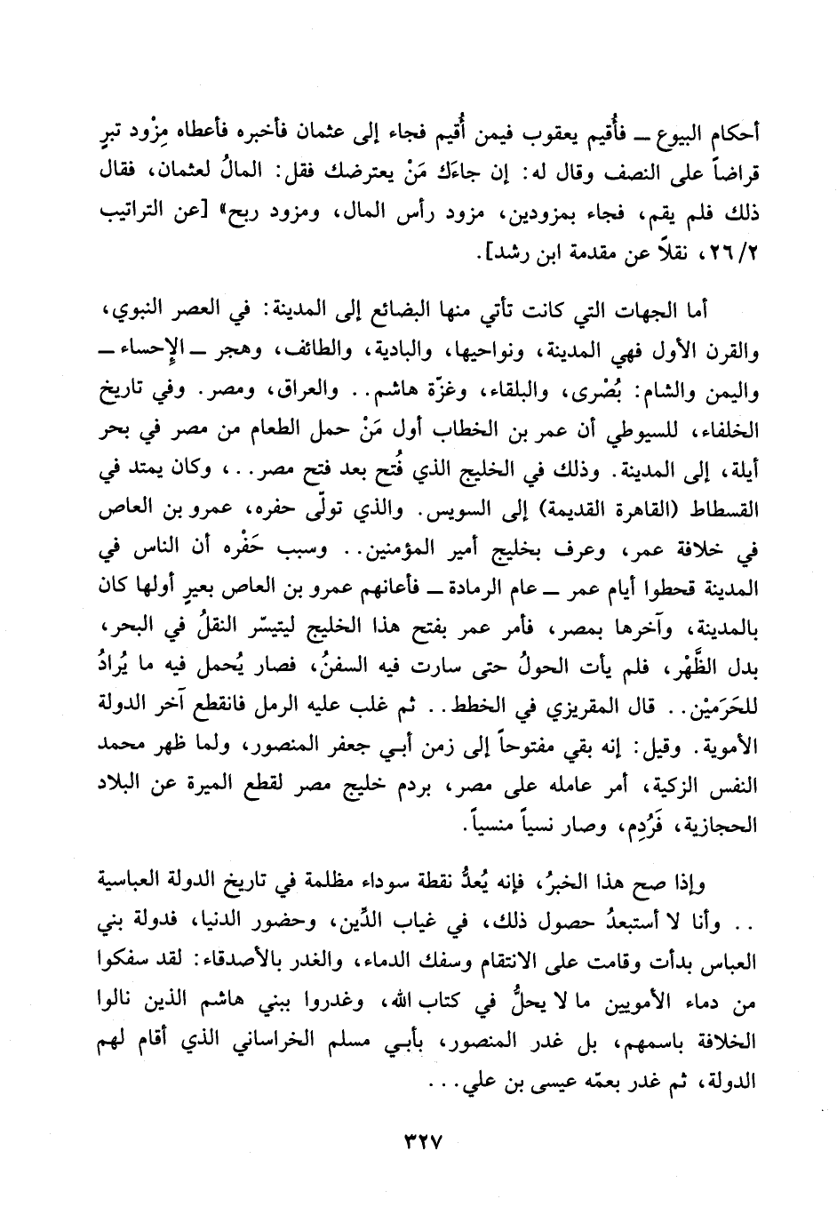 أحكام البيوع ـ فأقيم يعقوب فيمن اقيم فجاء الى عثمان فأخبره فأعطاه مزود تبر قراضاً على النصف وقال له: ان جاءك من يعترضك فقل: المال لعثمان، فقال ذلك فلم يقم، فجاء بمزودين، مزود رأس المال، ومزرد ربح)) [عن التراتيب 2/ 26، نقلاً عن مقدمة ابن رشد].
