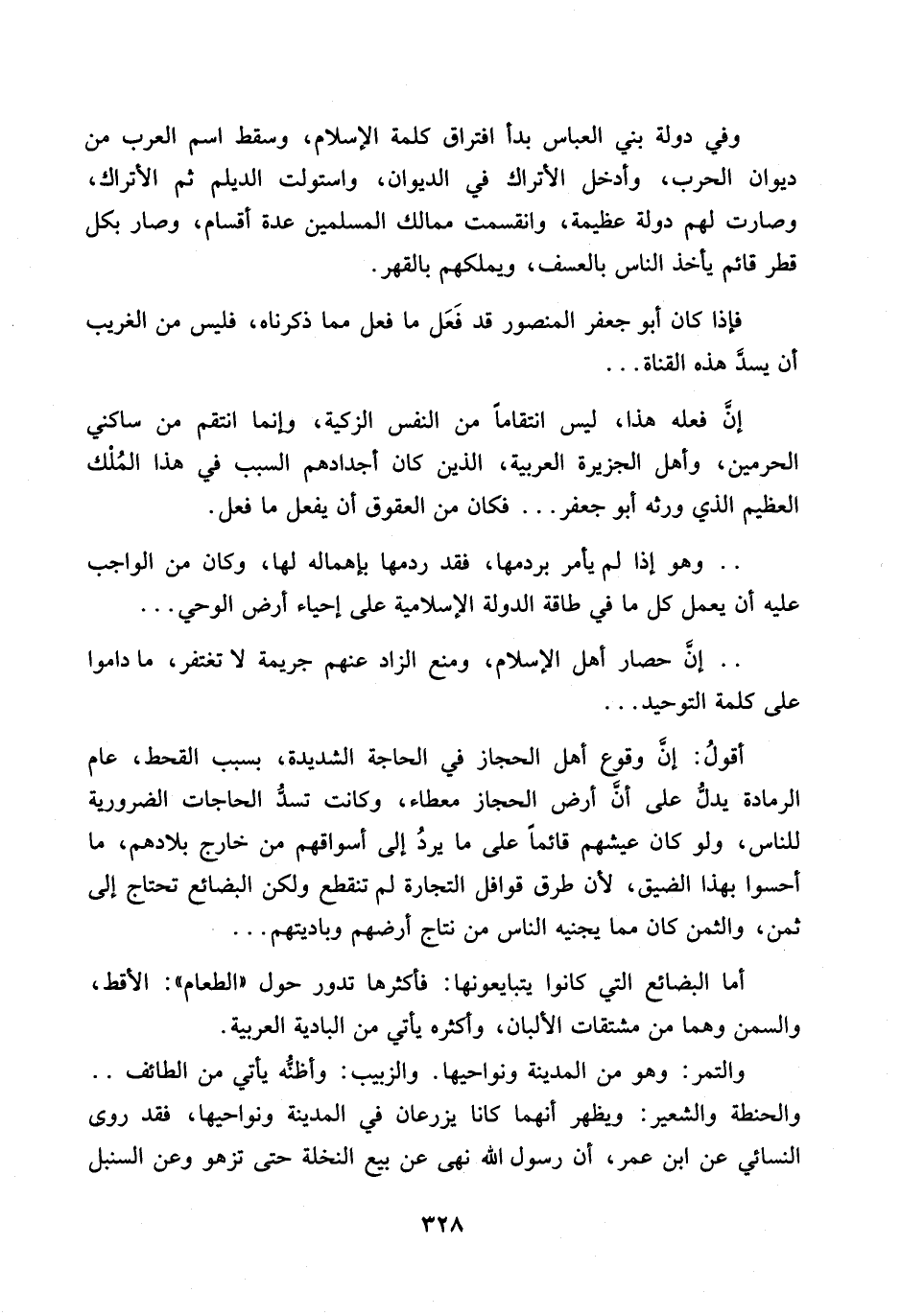 فاذا كان ابو جعفر المنصور قد فعل ما فعل مما ذكرناه، فليس من الغريب ان يسد هذه القناة ... ان فعله هذا، ليس انتقاما من النفس الزكية، وانما انتقم من ساكني الحرمين، وأهل الجزيرة العربية، الذين كان اجدادهم السبب في هذا الملك العظيم الذي ورثه ابو جعفر ... فكان من العقوق ان يفعل ما فعل ... وهو اذا لم يأمر بردمها، فقد ردمها بأهمالها لها، وكان من الواجب عليه ان يعمل كل مافي طاقة الدولة الاسلامية على احياء ارض الوحي ..... ان حصار اهل الاسلام، ومنه الزاد عنهم جريمة لا تغتفر، ما داموا على كلمة التوحيد ... أقول: ان وقوع اهل الحجاز في الحاجة الشديدة، بسبب القحط، عام الرمادة يدل على ان ارض الحجاز معطاء، وكانت تسد الحاجات الضرورية للناس، ولو كان عيشهم قائماً على ما يرد الى اسواقهم من خارج بلادهم، ما أحسوا بهذا الضيق، لأن طرق قوافل التجارة لم تنقطع ولكن البضائع تحتاج الى ثمن، والثمن كان مما يجنيه الناس من نتاج أرضهم وباديتهم ... أما البضائع التي كانوا يتبايعونها: فأكثرها تدور حول ((الطعام)): الأقط، والسمن وهما من مشتقات الألبان، وأكثره يأتي من البادية العربية.
