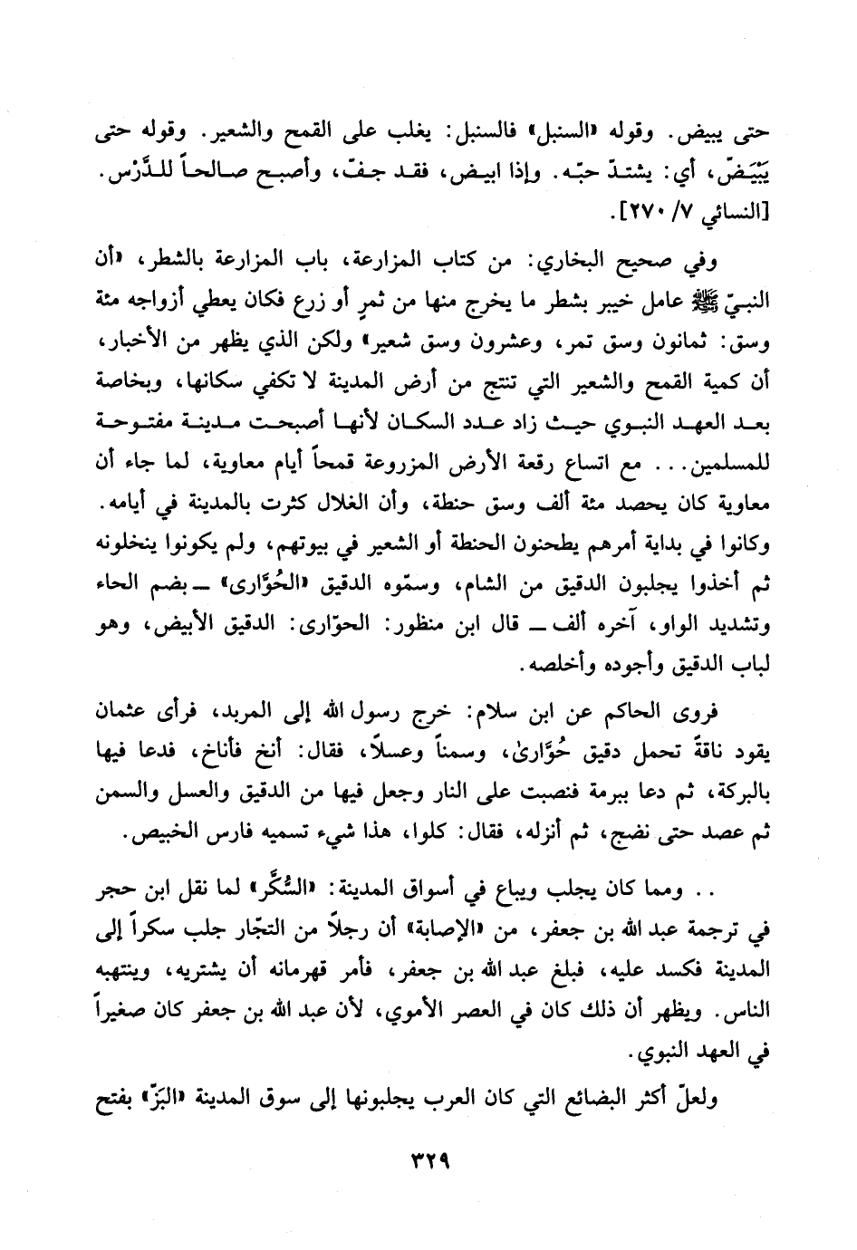 وفي صحيح البخاري: من كتاب المزارعة، باب المزارعة بالشطر، ((أن النبي صلى لله عليه وسلم عامل خيبر بشطر ما يخرج منها من ثمر او زرع فكان يعطي أزواجه مئة وسق: ثمانون وسق تمر، وعشرون وسق شعير)) ولكن الذي يظهر من الأخبار، ان كمية القمح والشعير التي تنتج من ارض المدينة لا تكفي سكانها، وبخاصة بعد العهد النبوي حيث زاد عدد السكان لأنها اصبحت مدينة مفتوحة للمسلمين ... مع اتساع رقعة الارض المزروعة قمحاً ايام معاوية، لما جاء ان معاوية كان يحصد مئة الف وسق حنطة، وان الغلال كثرت بالمدينة في ايامه.