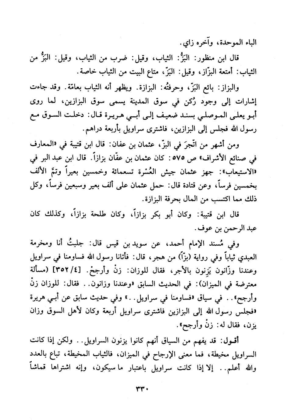 ومن أشهر من اتجر في البز عثمان بن عفان: قال ابن قتيبة في ((المعارف في صنائع الأشراف)) ص 575: كان عثمان بن عفان بزازاً.