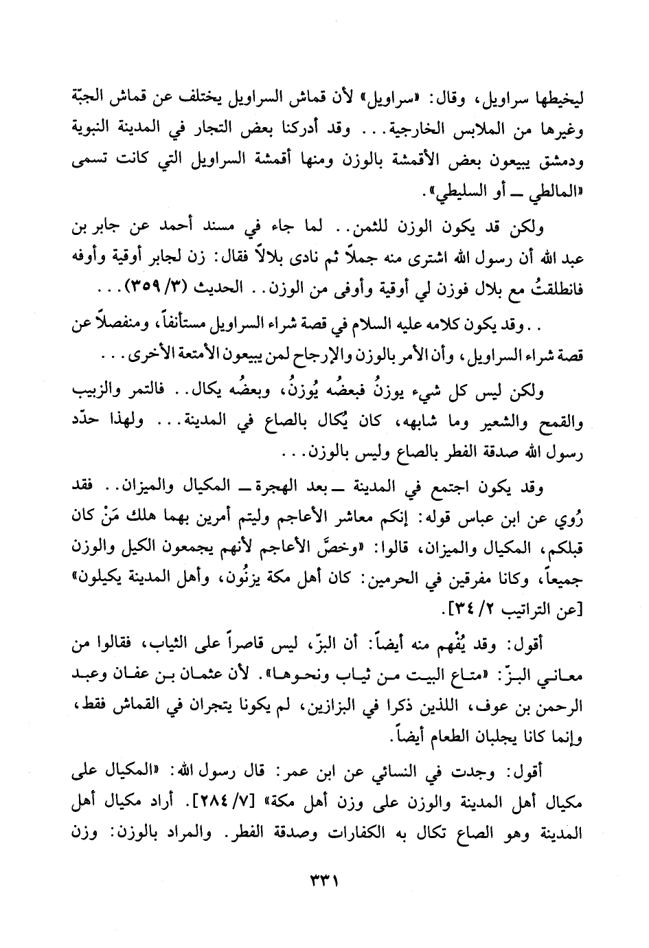 ولكن قد يكون الوزن للثمن .. لما جاء في مسند احمد عن جابر بن عبد الله ان رسول الله اشترى منه جملاً ثم نادى بلالاً فقال: زن لجابر أوقية وأوفه فانطلقت مع بلال فوزن لي اوقية وأوفى من الوزن .. الحديث (3/ 359) ..... وقد يكون كلامه عليه السلام في قصة شراء السراويل مستأنفاً، ومنفصلاً عن قصة شراء السراويل، وان الامر بالوزن والارجاح لمن يبيعون الأمتعة الاخرى ... ولكن ليس كل شيء يوزن فبعضه يوزن، وبعضه يكال .. فالتمر والزبيب والقمح والشعير وما شابهه، كان يكال بالصاع في المدينة ... ولهذا حدد رسول الله صدقة الفطر بالصاع وليس بالوزن ... وقد يكون اجتمع في المدينة ـ بعد الهجرة ـ المكيال والميزان .. فقد روي عن ابن عباس قوله: انكم معاشر الأعاجم وليتم امرين بهما هلك من كان قبلكم، المكيال والميزان، قالوا: ((وخص الأعاجم لأنهم يجمعون الكيل والوزن جميعاً، وكانا مفرقين في الحرمين: كان اهل مكة يزنون، واهل المدينة يكيلون)) [عن التراتيب 2/ 34].