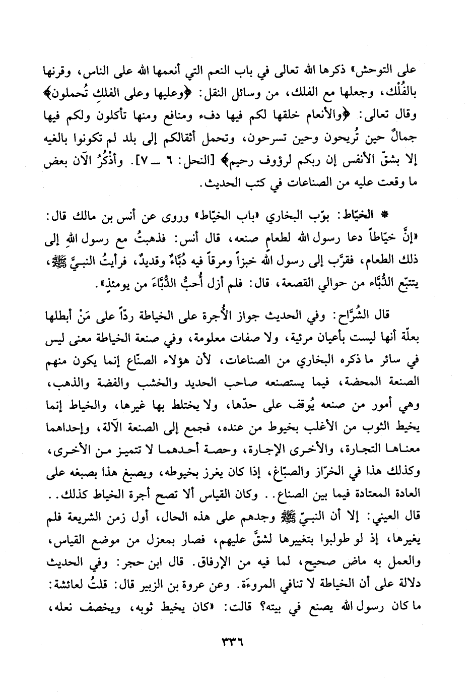 قال الشراح: وفي الحديث جواز الاجرة على الخياطة رداً على من ابطلها بعلة انها ليست بأعيان مرئية، ولا صفات معلومة، وفي صنعة الخياطة معنى ليس في سائر ما ذكره البخاري من الصناعات، لأن هؤلاء الصناع انما يكون منهم الصنعة المحضة، فيما يستصنعه صاحب الحديد والخشب والفضة والذهب، وهي امور من صنعه يوقف على حدها، ولا يختلط بها غيرها، والخياط انما يخيط الثوب من الأغلب بخيوط من عنده، فجمع الى الصنعة الآلة، واحداهما معناها التجارة، والاخرى الاجارة، وحصة أحدهما لا تتميز من الاخرى، وكذلك هذا في الخراز والصباغ، اذا كان يغرز بخيوطه، ويصبغ هذا بصبغه على العادة المعتادة فيما بين الصناع .. وكان القياس الا تصح اجرة الخياط كذلك .. قال العيني: الا ان النبي صلى لله عليه وسلم وجدهم على هذه الحال، اول زمن الشريعة فلم يغيرها، اذ لو طولبوا بتغييرها لشق عليهم، فصار بمعزل من موضع القياس، والعمل به ماض صحيح، لما فيم من الارفاق.