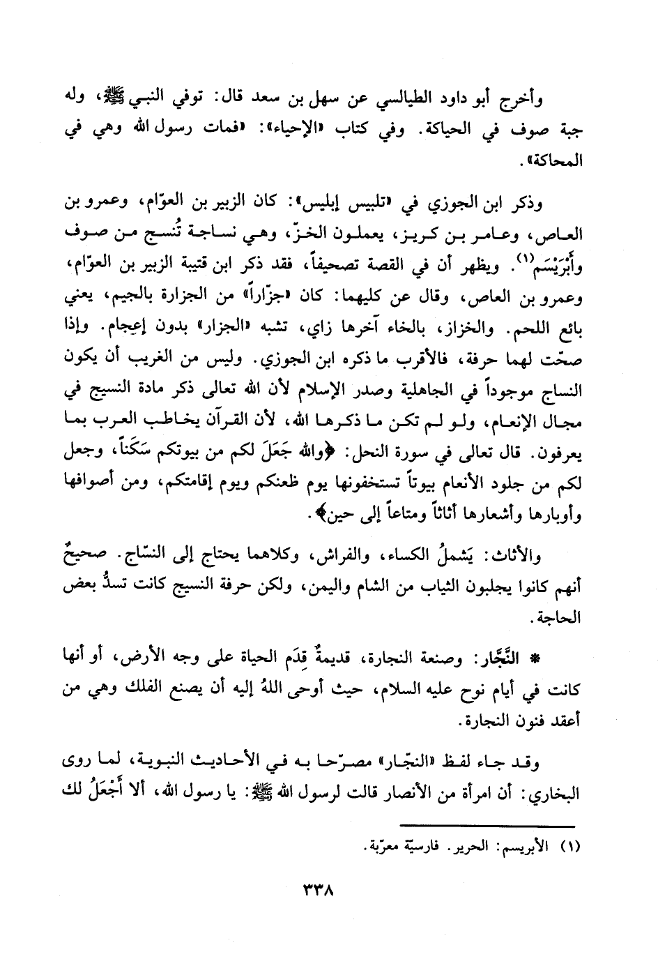 وذكر ابن الجوزي في ((تلبيس ابليس)): كان الزبير بن العوام، وعمرو بن العاص، وعامر بن كريز، يعملون الخز، وهي نساجة تنسج من صوف وأبريسم (1).