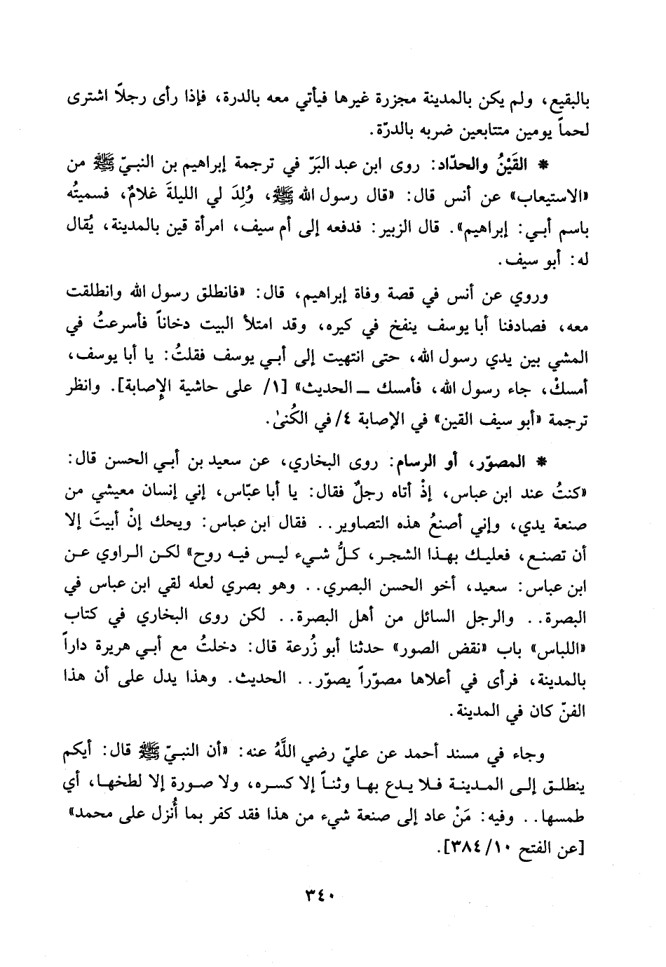 * المصور , او الرسام: روى البخاري , عن سعيد بن ابي الحسن قال: ((كنت عند ابن عباس , اذ اتاه رجل فقال: ياأبا عباس , اني انسان معيشي من صنعة يدي , واني اصنع هذه التصاوير .. فقال ابن عباس: ويحك ان ابيت الا ان تصنع , فعليك بهذا الشجر , كل شيء ليس فيه روح)) لكن الراوي عن ابن عباس: سعيد , اخو الحسن البصري .. وهو بصري لعله لقي ابن عباس في البصرة .. والرجل السائل من اهل البصرة .. لكن روى البخاري في كتاب ((اللباس)) باب ((نقض الصور)) حدثنا ابو زرعة قال: دخلت مع أبي هريرة دارا بالمدينة , فرأى في أعلاها مصورا يصور .. الحديث.