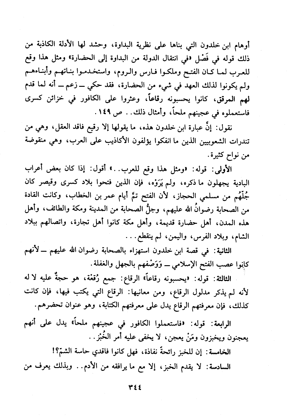 أوهام ابن خلدون التي بناها على نظرية البداوة، وحشد لها الأدلة الكاذبة من ذلك قوله في فصل ((في انتقال الدولة من البداوة إلى الحضارة)) ومثل هذا وقع للعرب لما كان الفتح وملكوا فارس والروم، واستخدموا بناتهم وأبناءهم ولم يكونوا لذلك العهد في شيء من الحضارة، فقد حكي ـ زعم ـ أنه لما قدم لهم المرقق، كانوا يحسبونه رقاعا، وعثروا على الكافور في خزائن كسرى فاستعملوه في عجينهم ملحا، وأمثال ذلك .. ص 149.