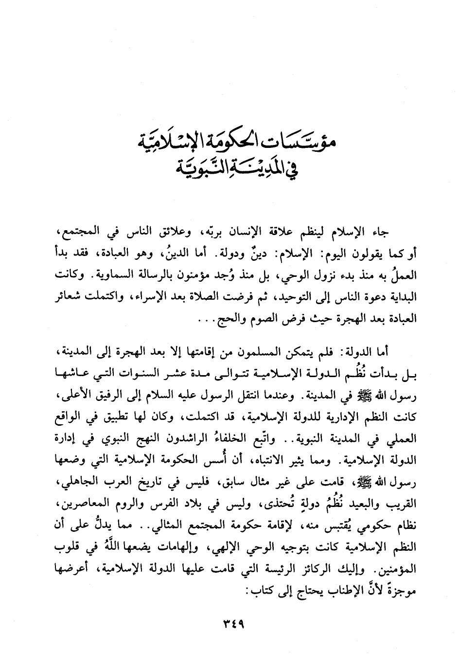وكانت البداية دعوة الناس الى التوحيد، ثم فرضت الصلاة بعد الاسراء، واكتملت شعائر العبادة بعد الهجرة حيث فرض الصوم والحج .... أما الدولة: فلم يتمكن المسلمون من اقامتها الا بعد الهجرة الى المدينة، بل بدأت نظم الدولة الاسلامية تتوالى مدة عشر السنوات التي عاشها رسول الله صلى الله عليه وسلم في المدينة. وعندما انتقل الرسول عليه السلام الى الرفيق الأعلى، كانت النظم الادارية للدولة الاسلامية، قد اكتملت، وكان لها تطبيق في الواقع العملي في المدينة النبوية .. واتبع الخلفاء الراشدون النهج النبوي في ادارة الدولة الاسلامية. ومما يثير الانتباه، ان اسس الحكومة الاسلامية التي وضعها رسول الله صلى الله عليه وسلم، قامت على غير مثال سابق، فليس في تاريخ العرب الجاهلي، القريب والبعيد نظم دولة تحتذى، وليس في بلاد الفرس والروم المعاصرين، نظام حكومي يقتبس منه، لاقامة حكومة المجتمع المثالي .. مما يدل على ان النظم الاسلامية كانت بتوجيه الوحي الالهي، والهامات يضعها الله في قلوب المؤمنين.