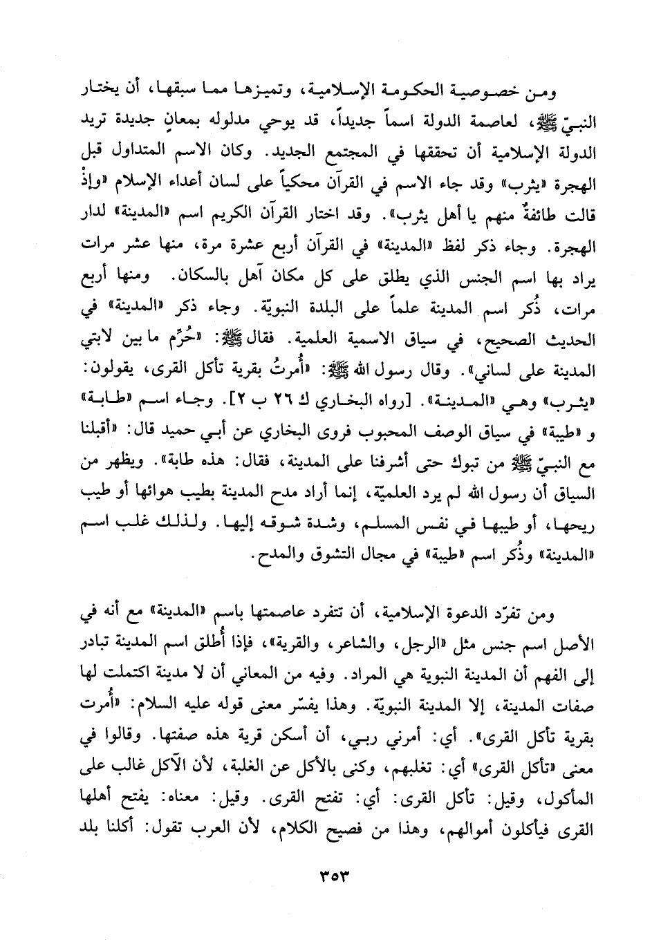 ومن تفرد الدعوة الاسلامية، ان تتفرد عاصمتها باسم ((المدينة)) مع انه في الاصل اسم جنس مثل ((الرجل، والشاعر، والقرية))، فاذا اطلق اسم المدينة تبادر الى الفهم ان المدينة النبوية هي المراد. وفيه من المعاني ان لا مدينة اكتملت لها صفات المدينة، الا المدينة النبوية.