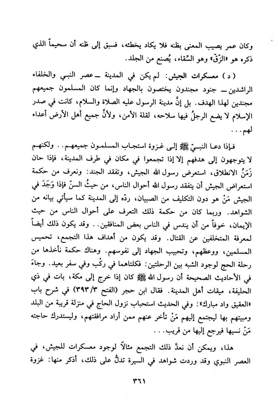 (د) معسكرات الجيش: لم يكن في المدينة ـ عصر النبي والخلفاء الراشدين ـ جنود مجندون يختصون بالجهاد وانما كان المسلمون جميعهم مجندين لهذا الهدف.