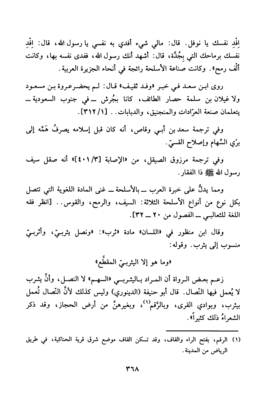 قال ابو حنيفة (الدينوري) وليس كذلك لأن النصال تعمل بيثرب، وبوادي القرى، وبالرقم (1)، وبغيرهن من أرض الحجاز، وقد ذكر الشعراء ذلك كثيراً)).