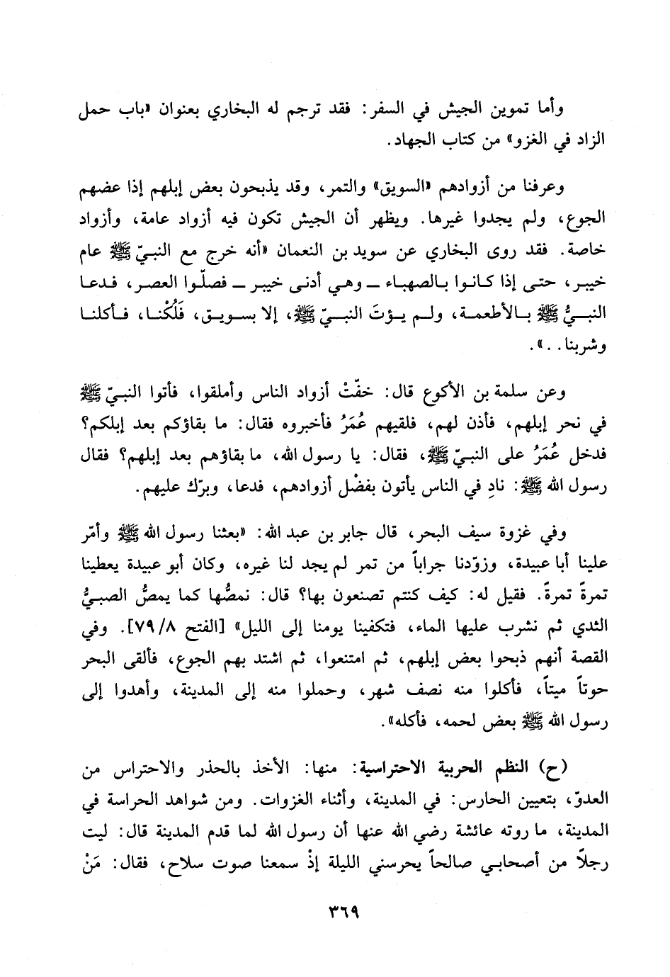 وعن سلمة بن الأكوع قال: خفت ازواد الناس وأملقوا، فأتوا النبي صلى الله عليه وسلم في نحر ابلهم، فاذن لهم، فلقيهم عمر فأخبروه فقال: ما بقاؤكم بعد ابلكم؟ فدخل عمر على النبي صلى الله عليه وسلم، فقال: يا رسول الله، ما بقاؤهم بعد ابلهم؟ فقال رسول الله صلى الله عليه وسلم: ناد في الناس يأتون بفضل ازوادهم، فدعا، وبرك عليهم.