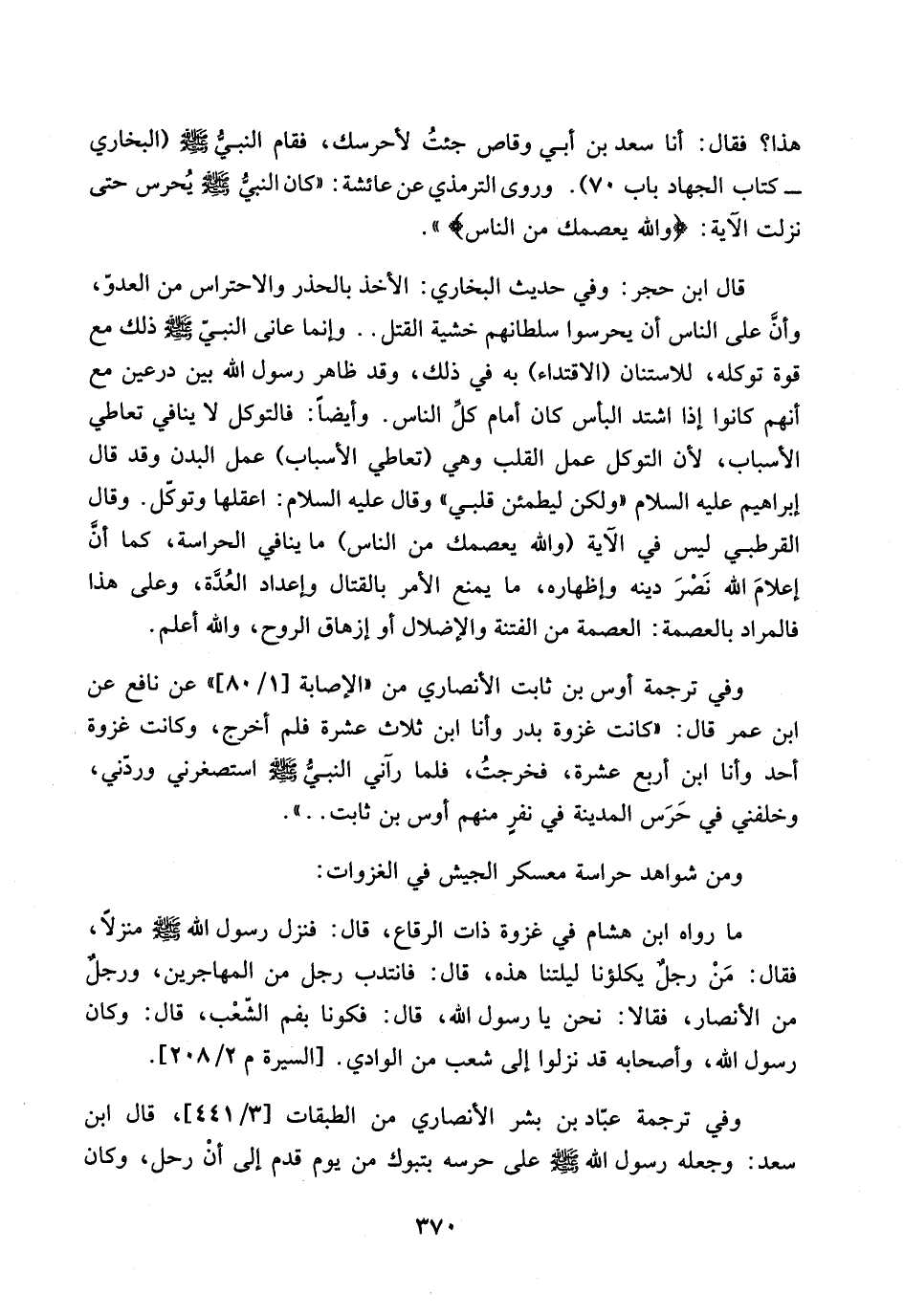 هذا؟ فقال: انا سعد بن ابي وقاص جئت لاحرسك، فقام النبي صلى الله عليه وسلم (البخاري ـ كتاب الجهاد باب 70).