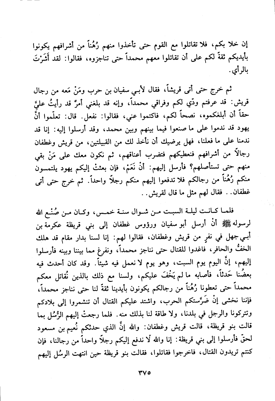 375…إن خلا بكم، فلا تقاتلوا مع القوم حتى تأخذوا منهم رهناً من اشرافهم يكونوا بأيديكم ثقة لكم على أن تقاتلوا معهم محمداً حتى تناجزوه، فقالوا: لقد أشرت بالرأي.