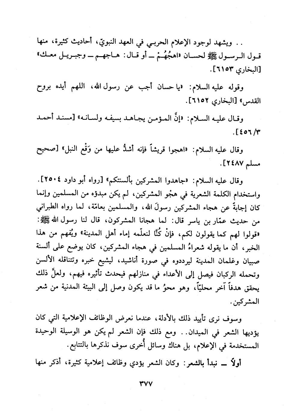 وقال عليه السلام: ((اهجوا قريشا فانه اشد عليها من وقع النبل)) [صحيح مسلم 2487].