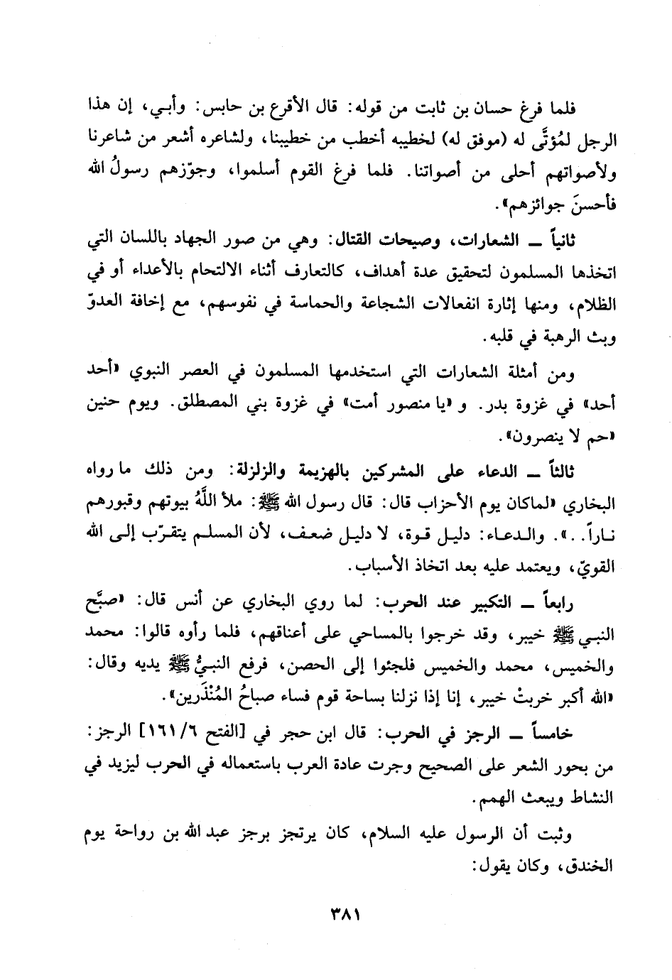 خامسا ـ الرجز في الحرب: قال ابن حجر في [الفتح 6/ 161] الرجز: من بحور الشعر على الصحيح وجرت عادة العرب باستعماله في الحرب ليزيد في النشاط ويبعث الهمم.