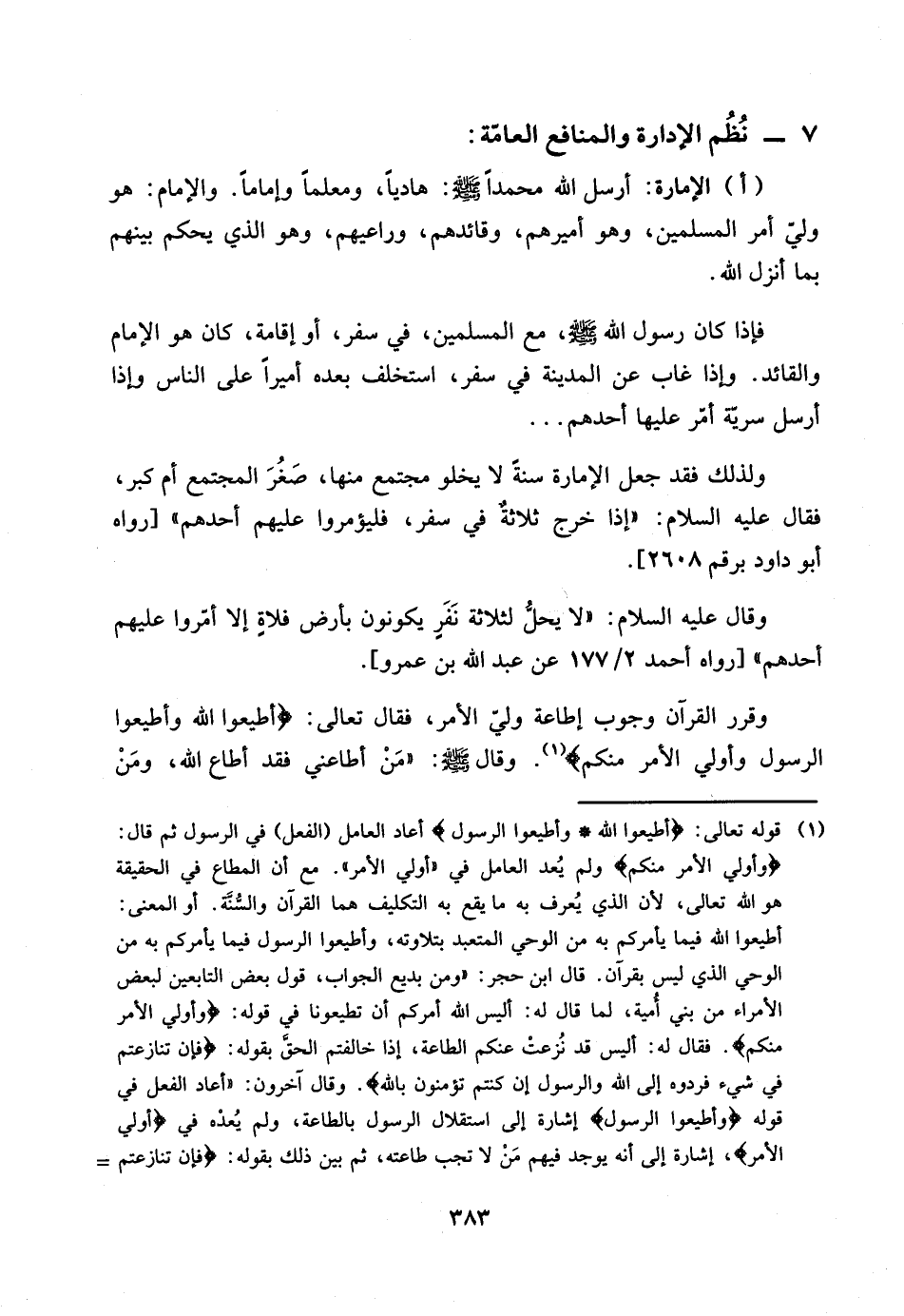 ولذلك فقد جعل الإمارة سنة لا يخلو مجتمع منها، صغر المجتمع أم كبر، فقال عليه السلام: ((إذا خرج ثلاثة في سفر، فليؤمروا عليهم أحدهم)) [رواه أبو داود برقم 2608].