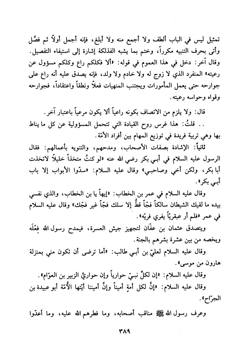ثانياً: الإشادة بصفات الاصحاب، ومدحهم، والتنويه بأعمالهم: فقال الرسول عليه السلام في ابي بكر رضي الله عنه ((لو كنت متخذاً خليلاً لاتخذت أبا بكر، ولكن أخي وصاحبي)) وقال عليه السلام: ((سدوا الأبواب الا باب ابي بكر)).