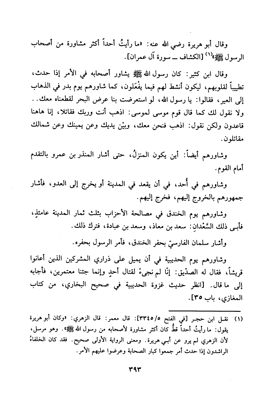 393…وقال ابو هريرة رضي الله عنه: ((ما رأيت احداً أكثر مشاورة من اصحاب الرسول صلى الله عليه وسلم (1) [الكشاف ـ سورة آل عمران].