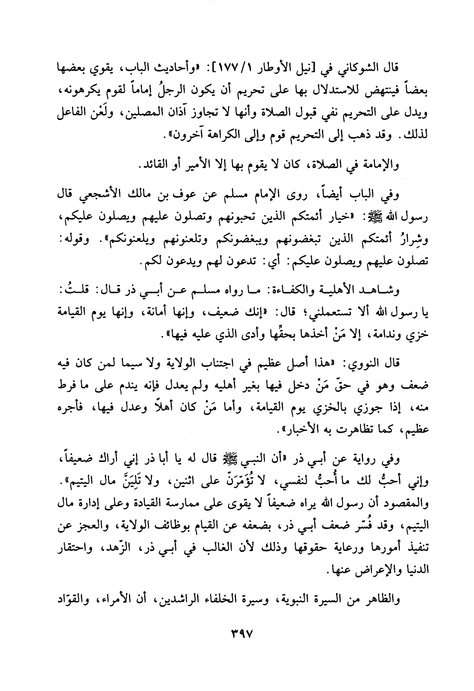 قال الشوكاني في [نيل الاوطار 1/ 177]: ((واحاديث الباب، يقوي بعضها بعضاً فينتهض للاستدلال بها على تحريم ان يكون الرجل اماماً لقوم يكرهونه، ويدل على التحريم نفي قبول الصلاة وانها لا تجاوز آذان المصلين، ولعن الفاعل لذلك.