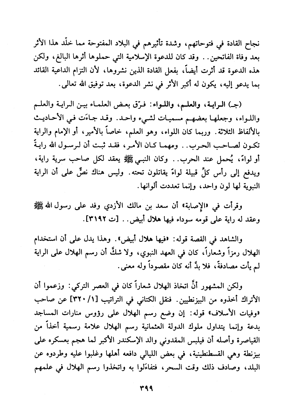 فنقل الكتاني في التراتيب [1/ 320] عن صاحب ((وفيات الأسلاف)) قوله: ان وضع رسم الهلال على رؤوس منارات المساجد بدعة وانما يتداول ملوك الدولة العثمانية رسم هلال علامة رسمية اخذاً من القياصرة واصله ان فيلبس المقدوني والد الإسكندر الأكبر لما هجم بعسكره على بيزنطة وهي القسطنطينية، في بعض الليالي دافعه اهلها وغلبوا عليه وطردوه عن البلد، وصادف ذلك وقت السحر، فتفاءلوا به واتخذوا رسم الهلال في علمهم…